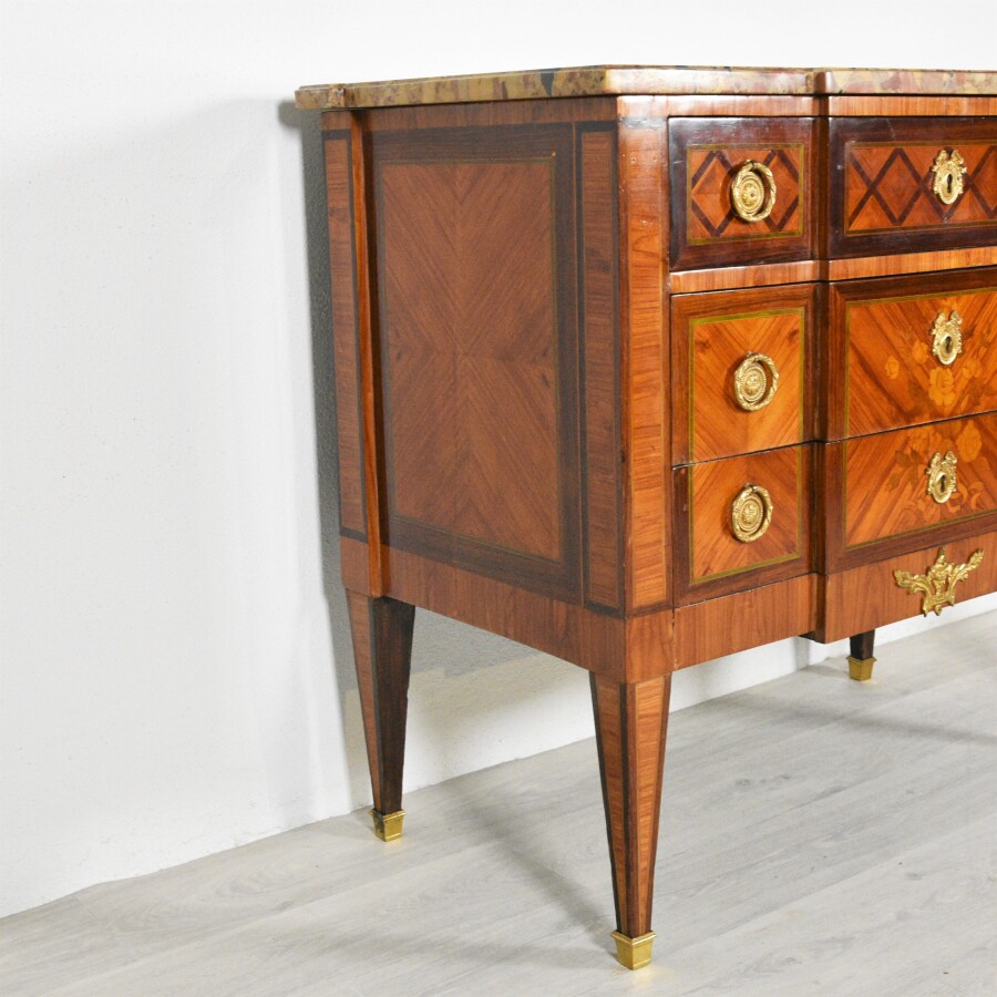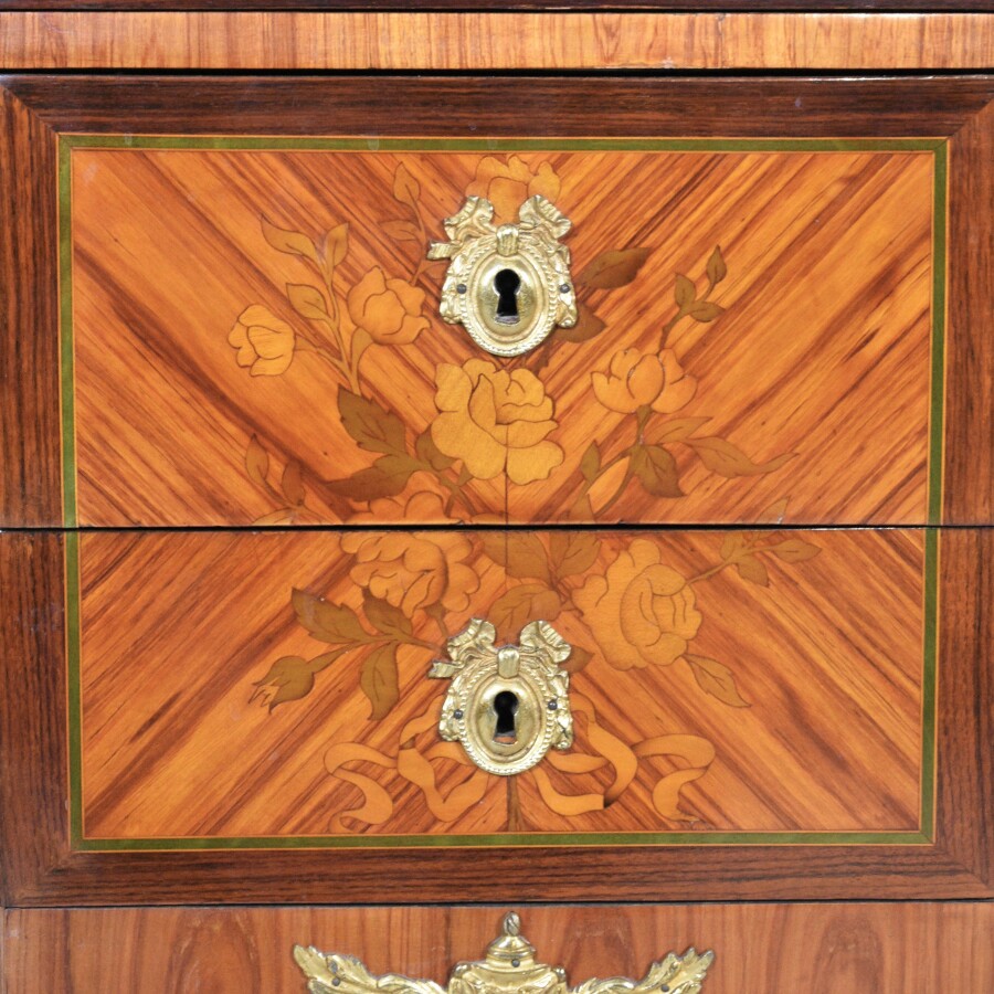 Petite commode à ressaut central de style Louis XVI, en placage de bois exotiques, à décor marqueté de bouquet fleuri, losanges, croisillons et ailes de papillon, ouvrant en façade à trois rangs de tiroirs, 2 sans traverses, ornementation de bronzes dorés et ciselés tels que entrées de serrure au noeud Marie-Antoinette, anneaux de tirages feuillagés, tablier figurant une urne feuillagée et pieds chaussés de sabots, elle est coiffée d'un brèche d'Alep, piétement gaine, parties anciennes, remontage moderne, 88 x 49 x H. 84 cm (quelques manques au placage, sans clé).