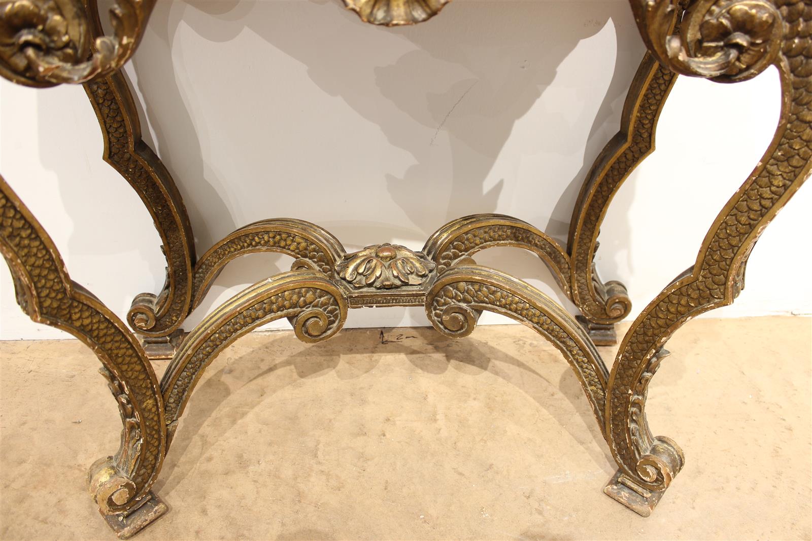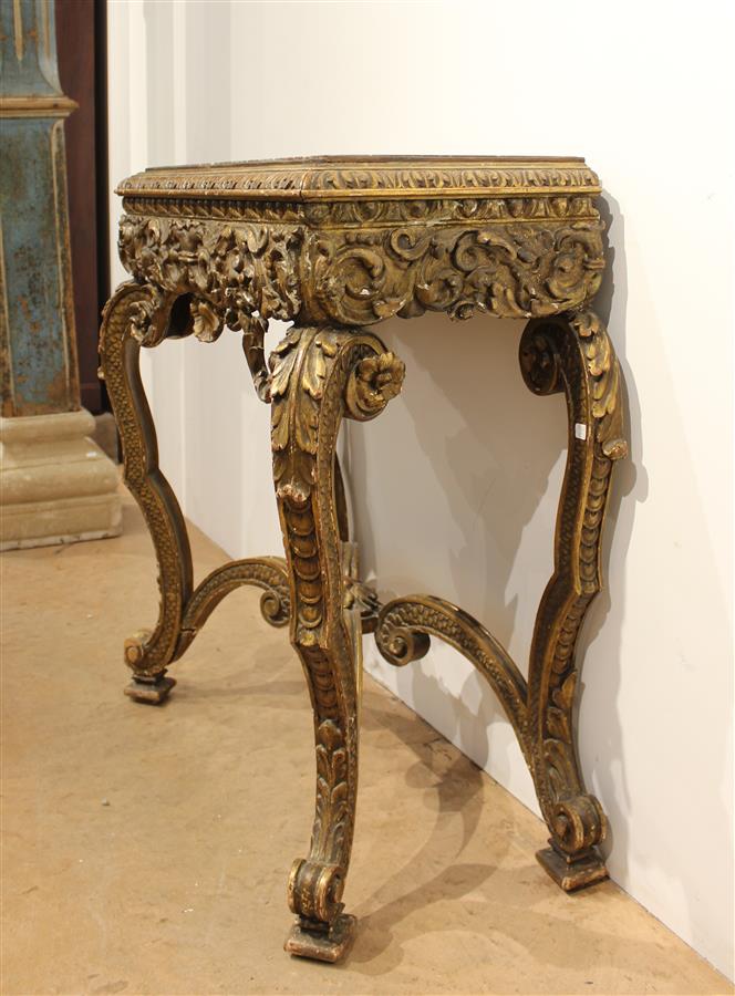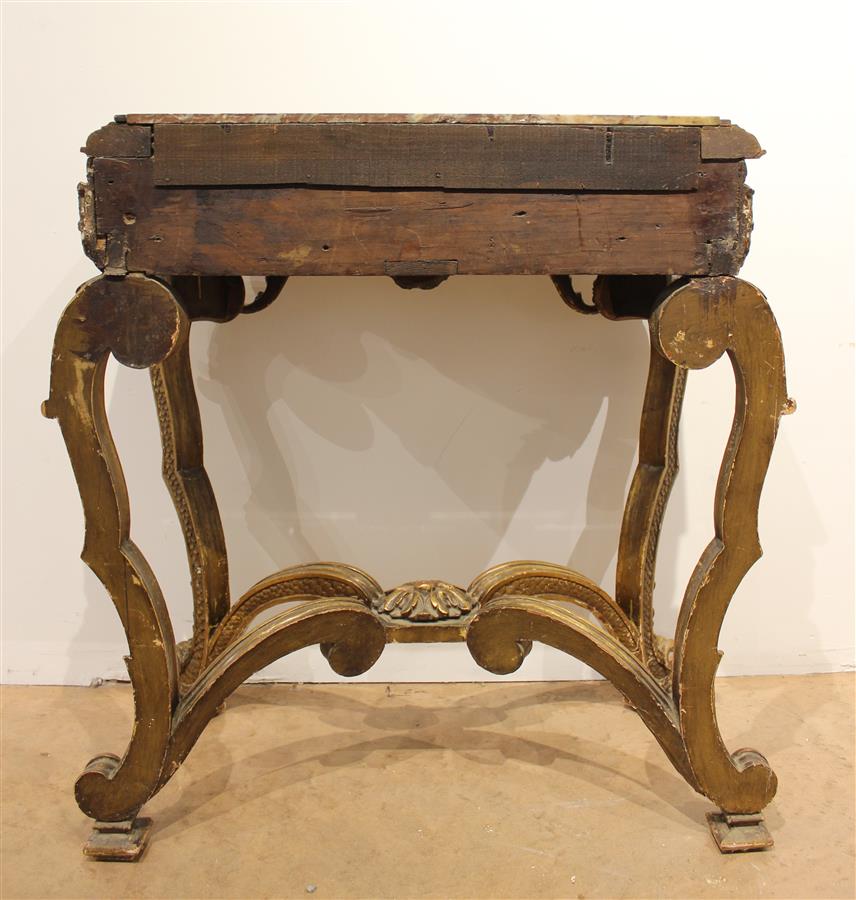 Petite console italienne style Rococo, montants en bois doré et richement sculpté à décor d'écailles, d'oves, de feuilles d'acanthe et d'une coquille, piétement cambré relié par une entretoise formée par quatre volutes reliées par un dé de raccordement feuillagé, elle est coiffée d'un marbre rouge des Flandres encastré, 18e siècle, 81 x 38 x H. 88 cm (petits manques)