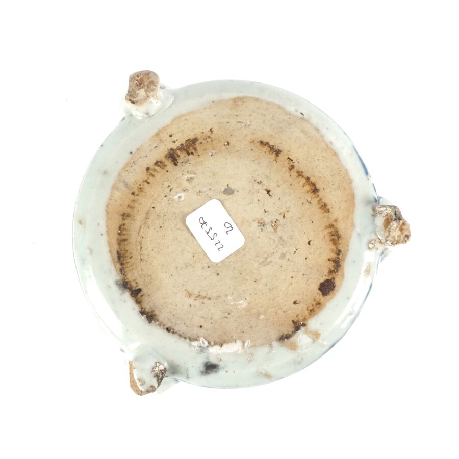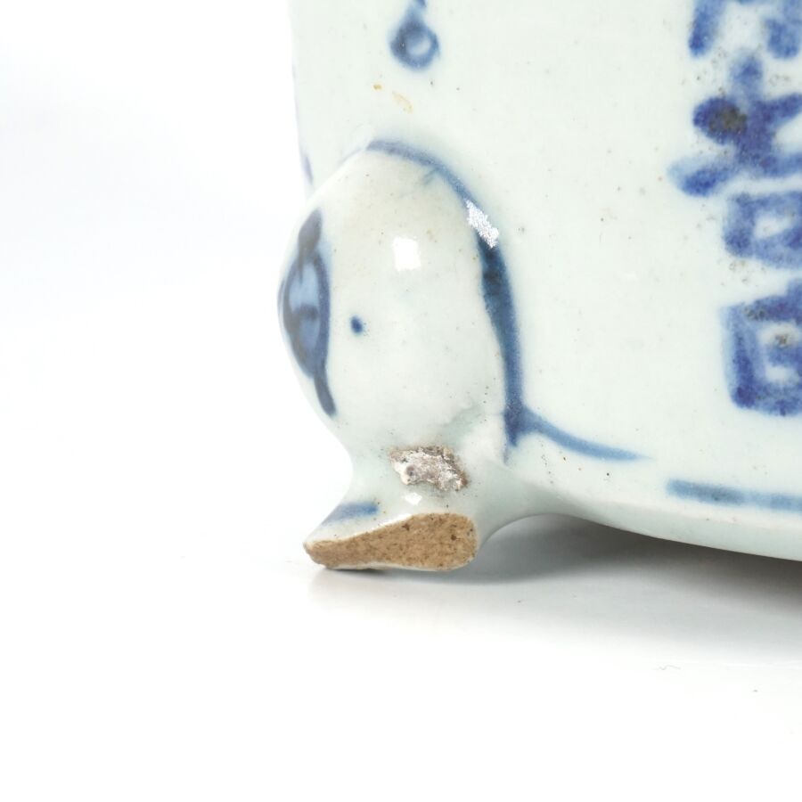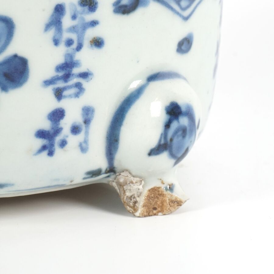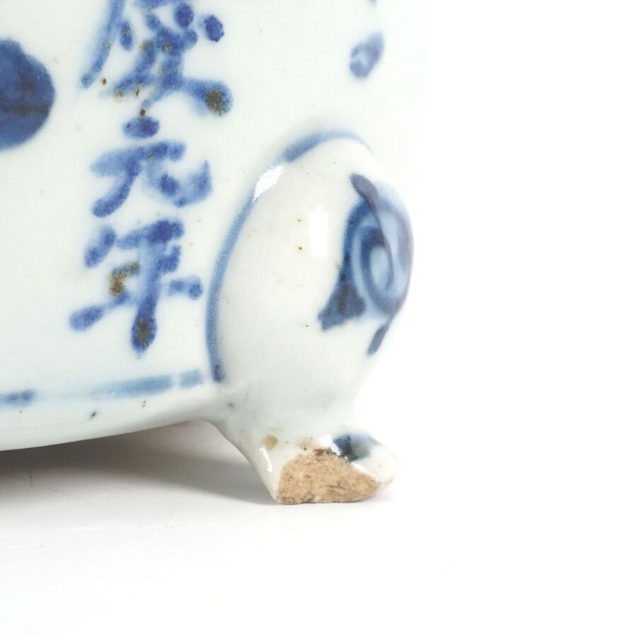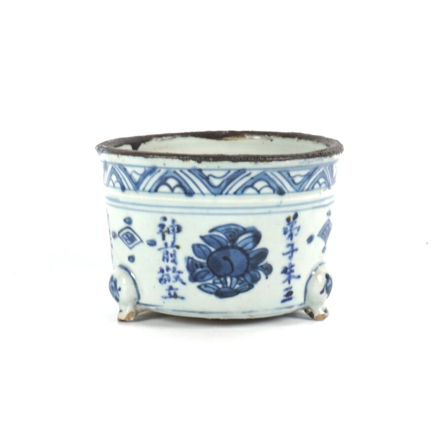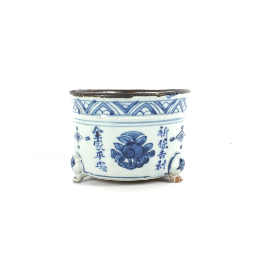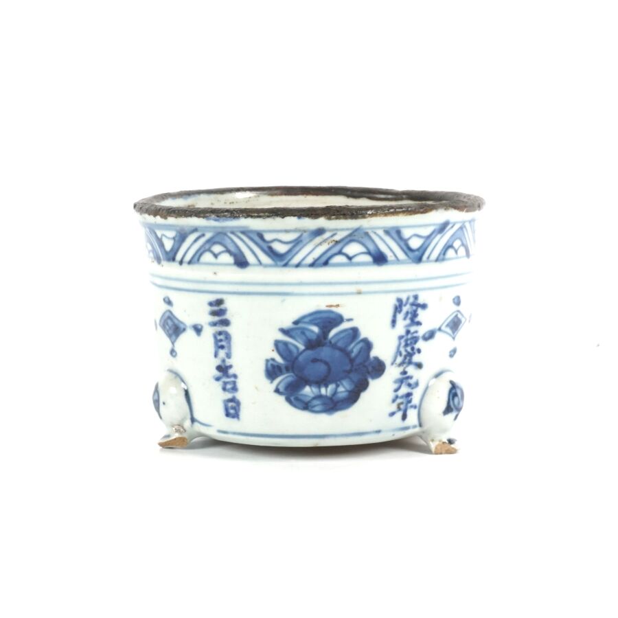 Petite jardinière tripode, en porcelaine bleu blanc, à décor de motifs stylisés et calligraphiés portant la mention de la première année de Longqing (1567-1572), fin de l'époque Ming, Chine, époque Qing, Dim. 10.3 x 5 cm (éclats).