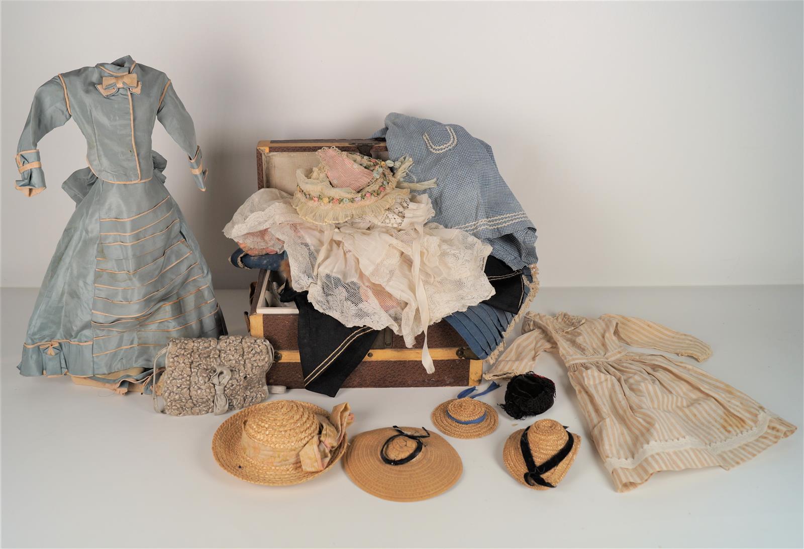 Petite malle bombée comprenant des éléments de trousseau dont robes et chapeaux, de différentes époques dont parisiennes, L. 28 cm.