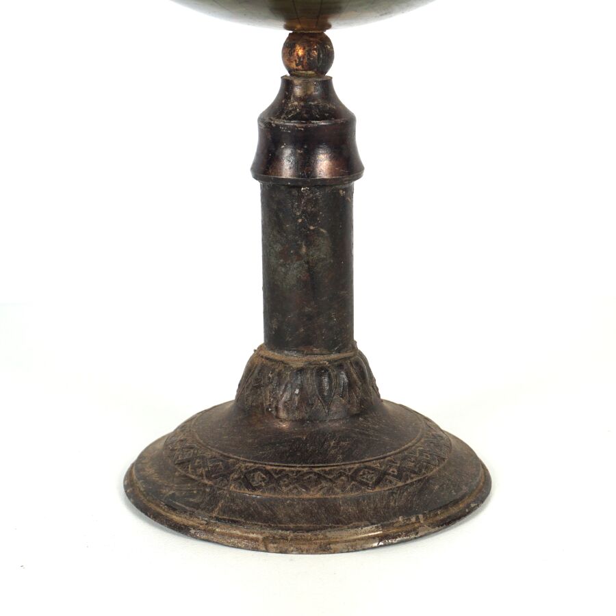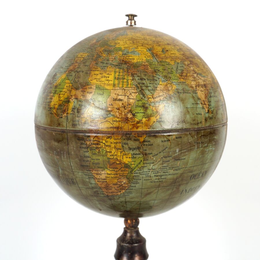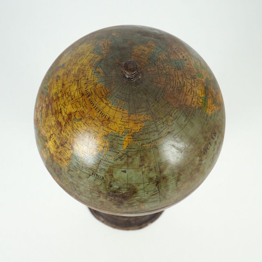 Petite mappemonde en tôle polychrome, piètement en métal figurant une colonne, H. 30.5 cm (taches et traces).