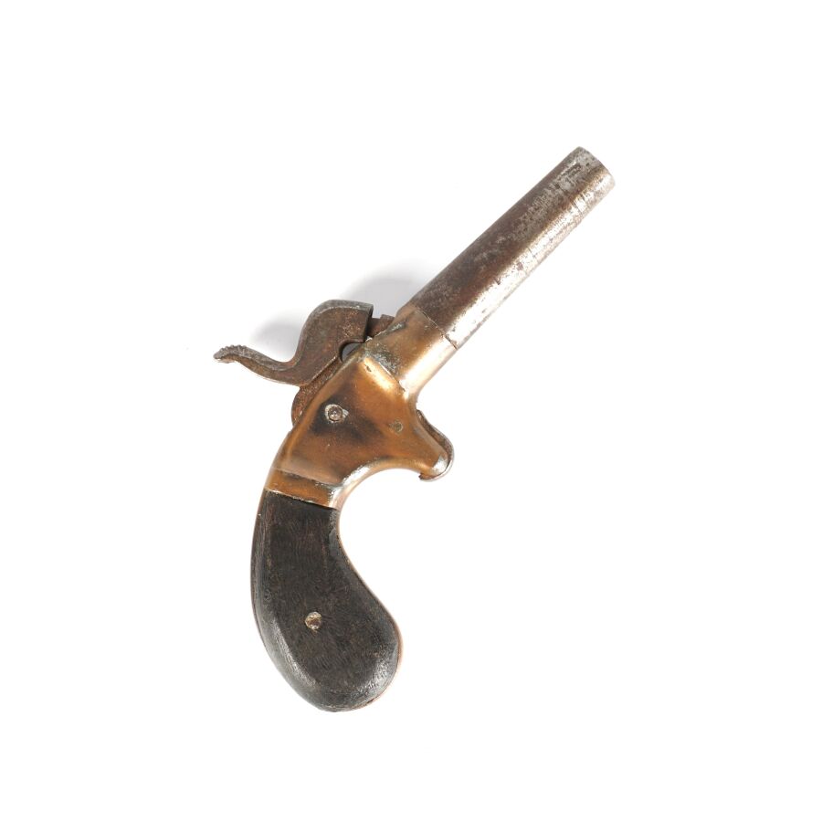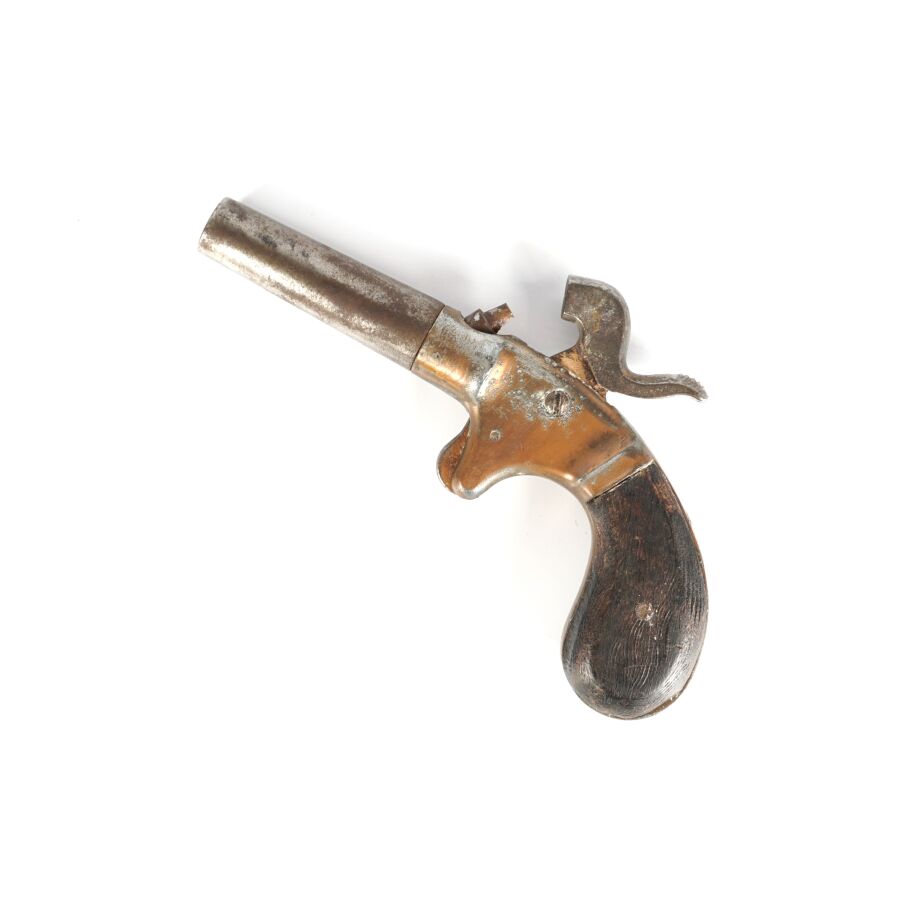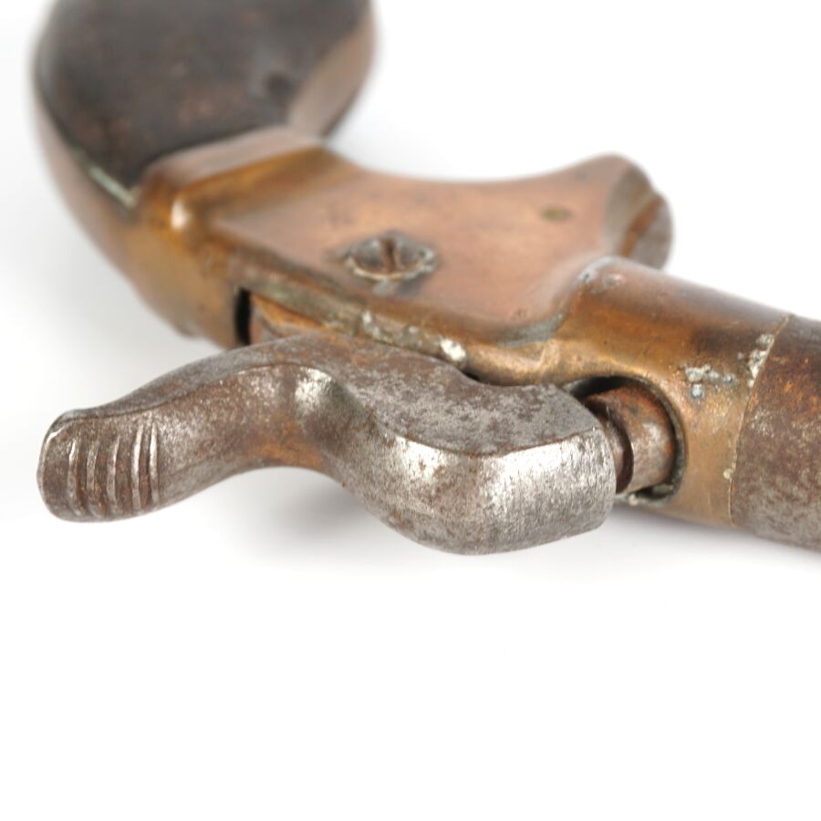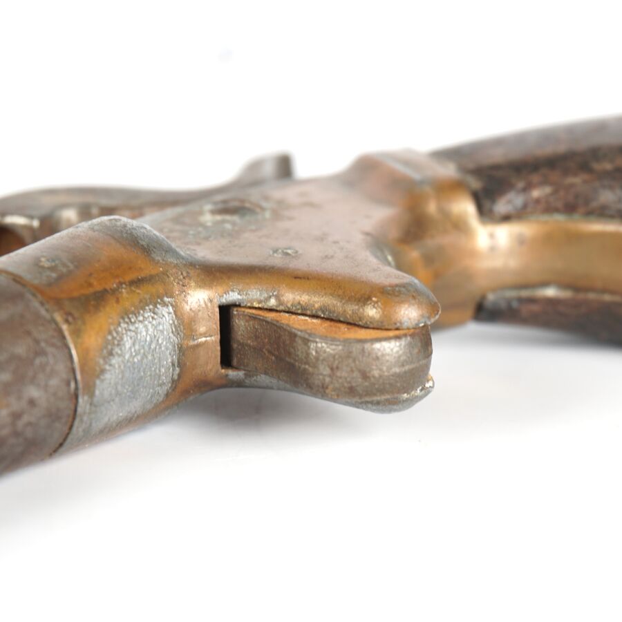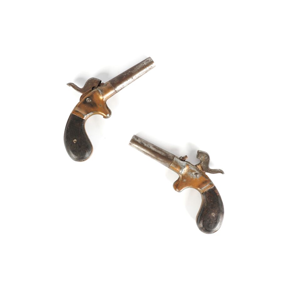 Petite PAIRE DE PISTOLETS A PERCUSSION A BALLE FORCEE, canons ronds de 5,2 cm à balles forcées, détentes éperons, plaquettes de crosse ne bois, fonctionnement à revoir pour l'un des deux, longueur : 13,5 cm, vers 1850, DANS L'ETAT.