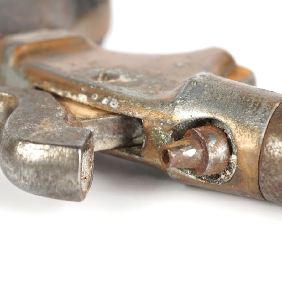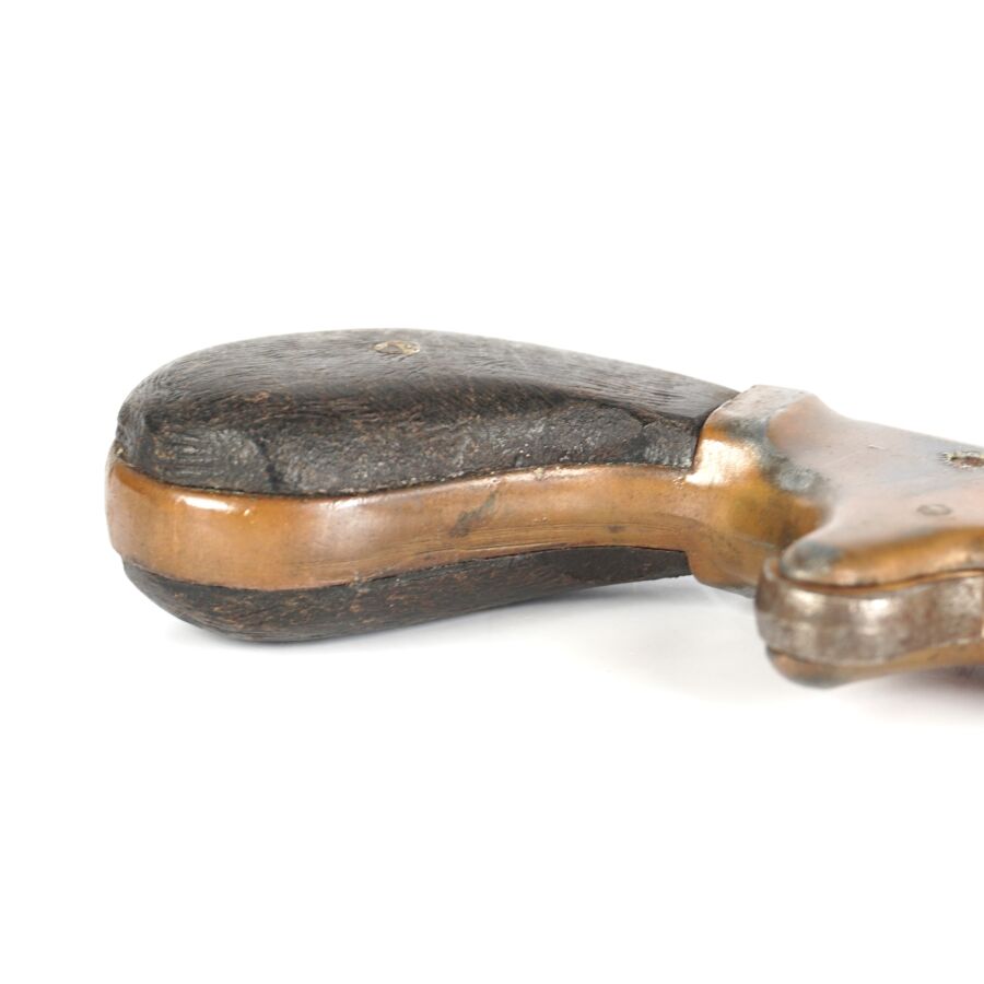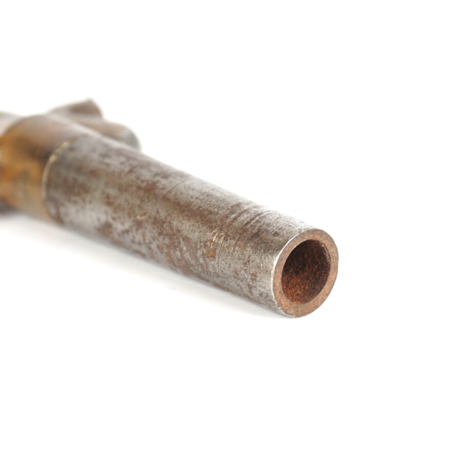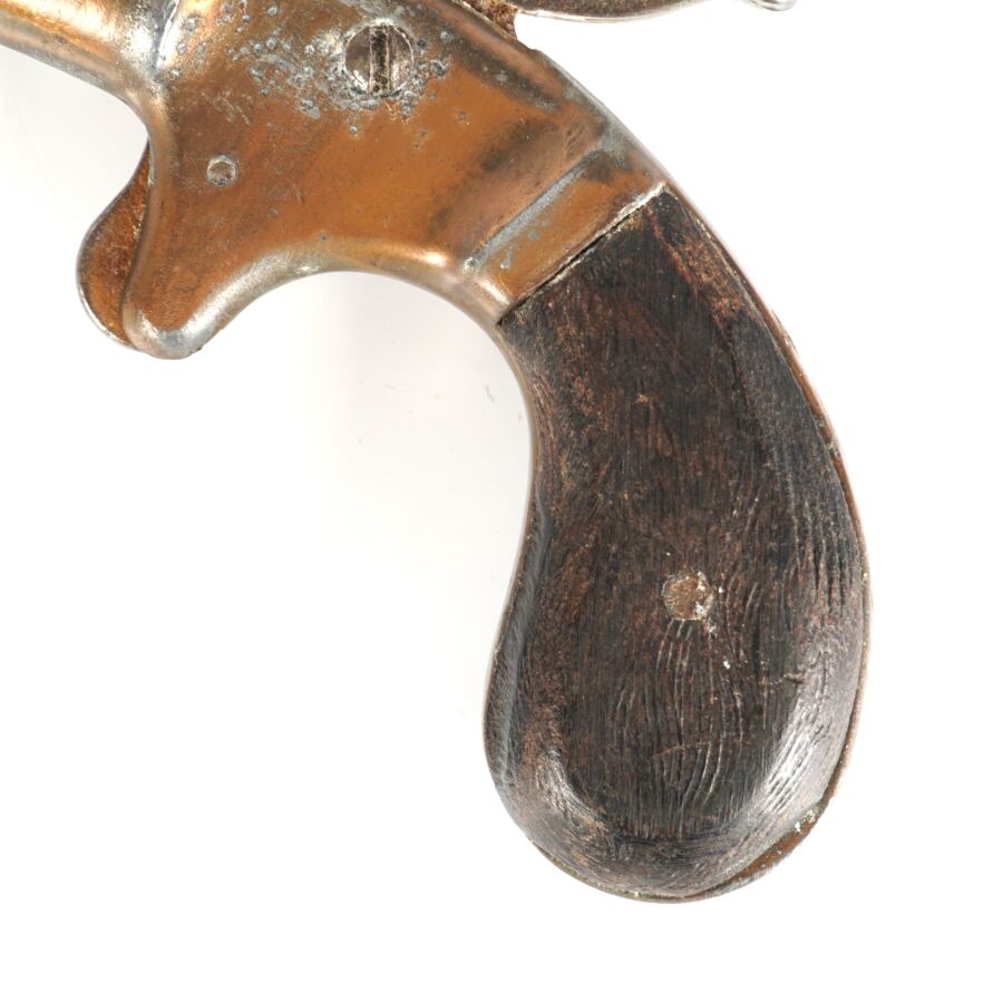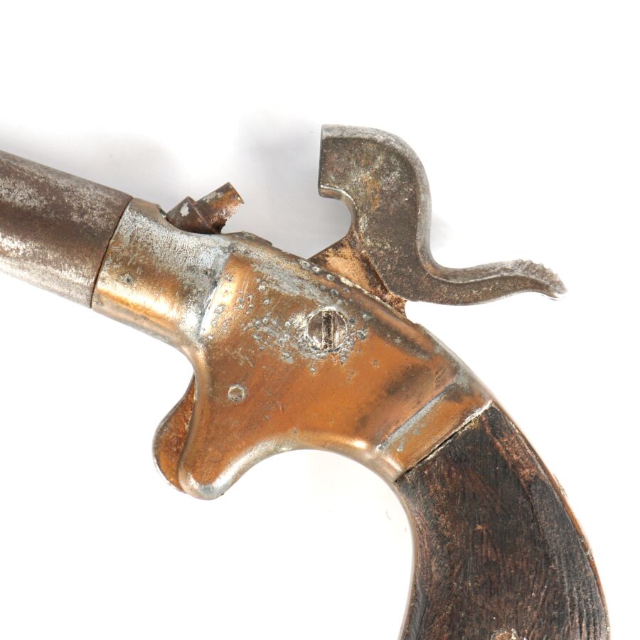 Petite PAIRE DE PISTOLETS A PERCUSSION A BALLE FORCEE, canons ronds de 5,2 cm à balles forcées, détentes éperons, plaquettes de crosse ne bois, fonctionnement à revoir pour l'un des deux, longueur : 13,5 cm, vers 1850, DANS L'ETAT.