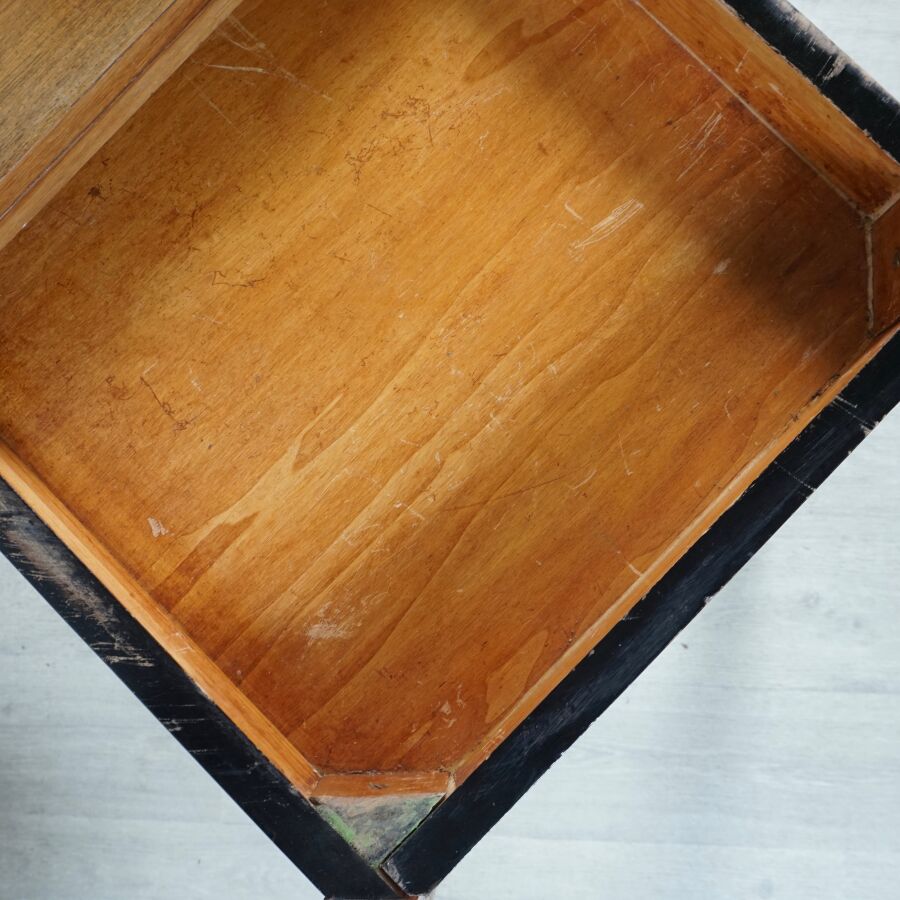 Petite table à transformation en bois verni, plateau pivotant et dépliant, piètement en coupe sabre, Dim. (fermée) : 74.6 x 91 x 59.5 cm. Dim. (ouverte) : 119 x 91 cm (usures d'usage).