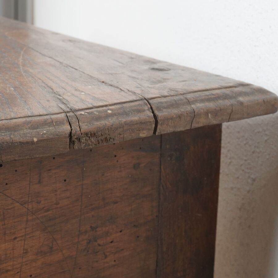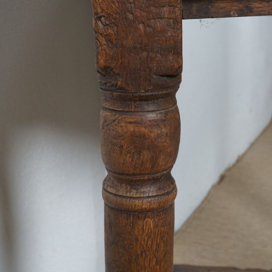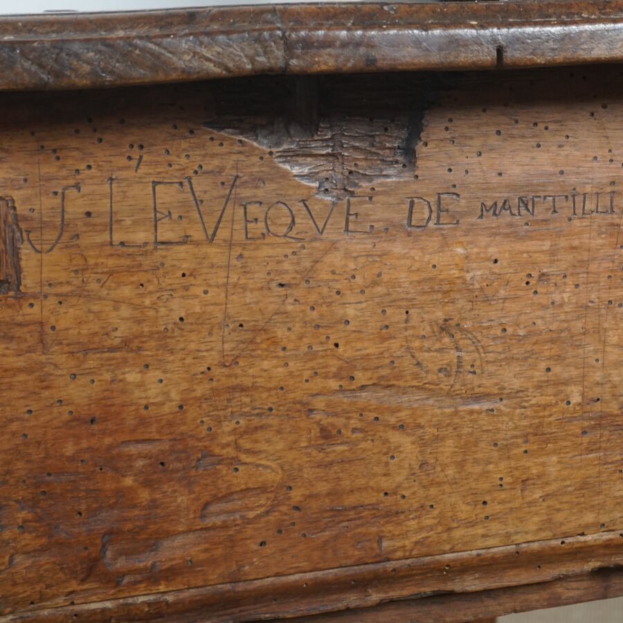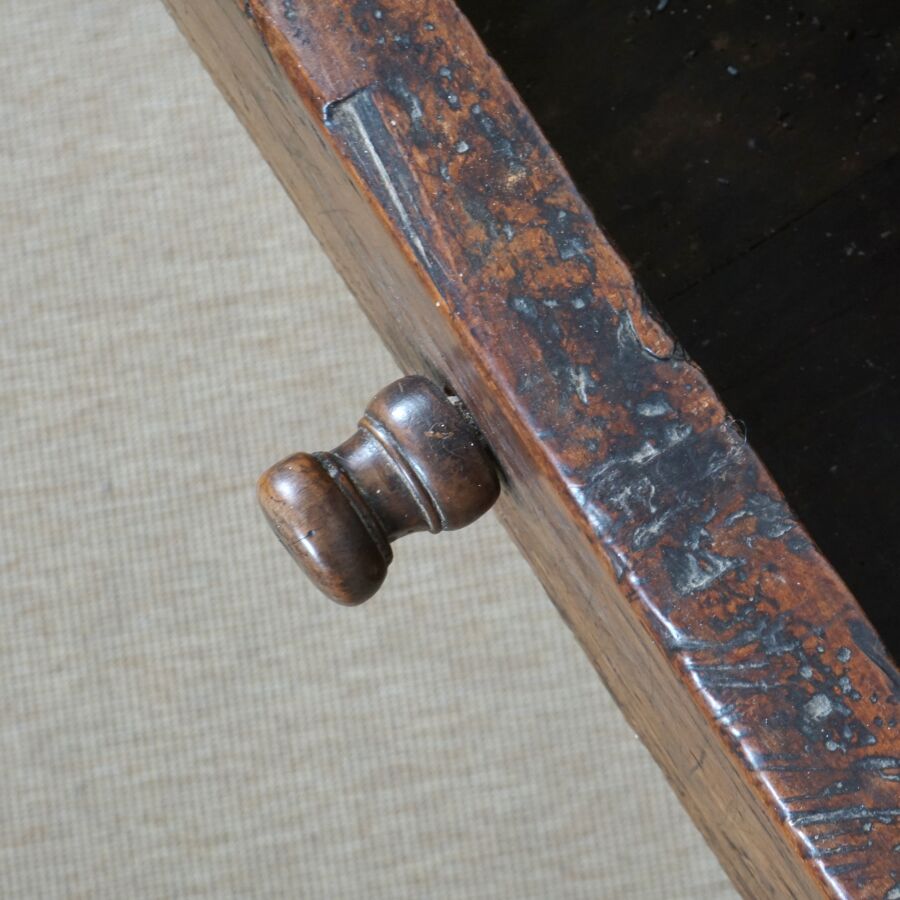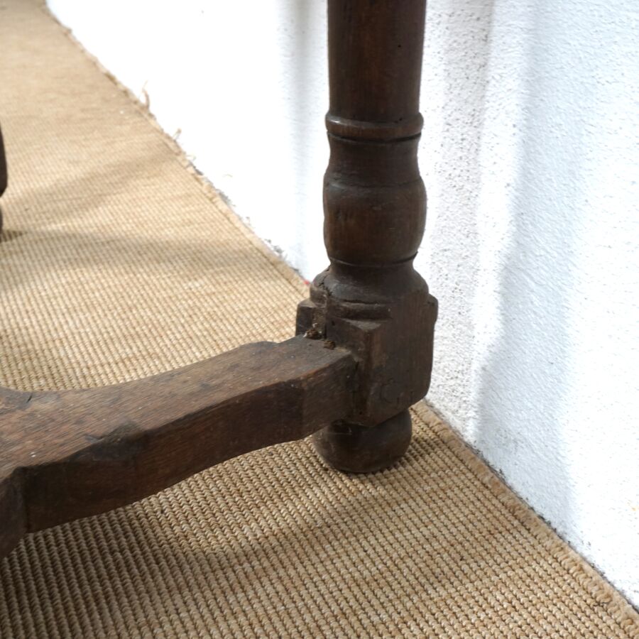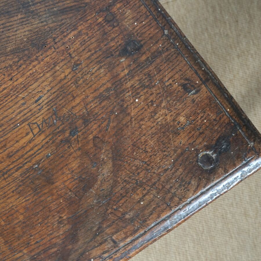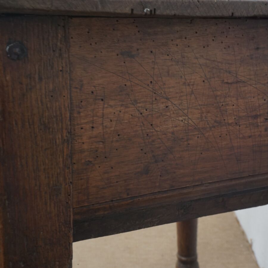 Petite table d'appoint en chêne ouvrant à un tiroir en ceinture, piétement tourné réuni par une entretoise en H, travail régional 18ème siècle, 73.5 x 60.5 x 48.5 cm (usures, noms gravés, vermoulu).