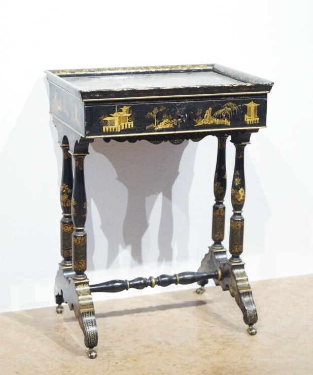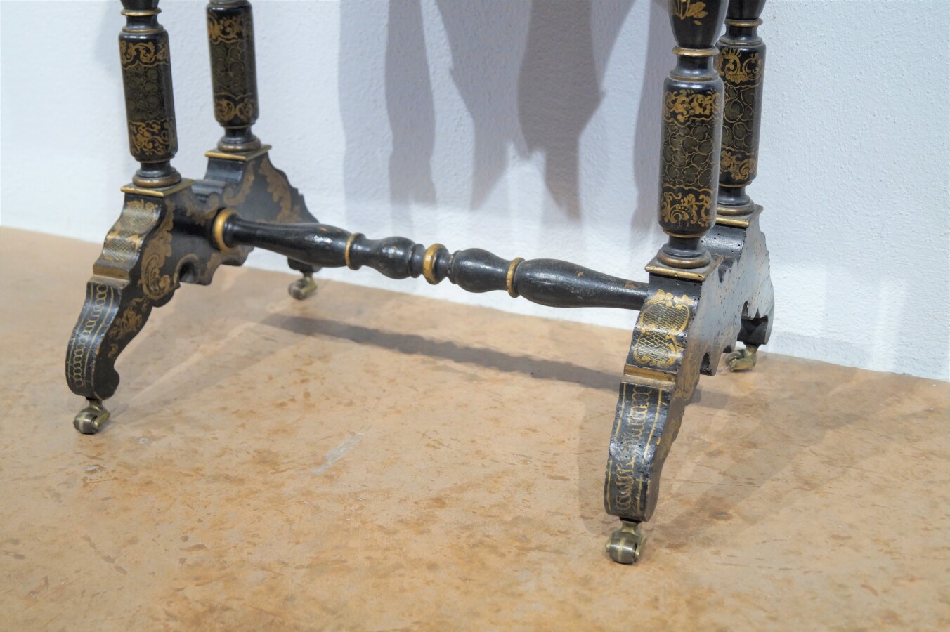 Petite table travailleuse en laque anglaise, à décor doré de pagodes et personnages, piétement "colonne" relié par une entretoise tournée, quatre pieds sur roulettes, 53 x 38 x H. 71 cm (restaurations, repeints, un pied recollé, en l'état).