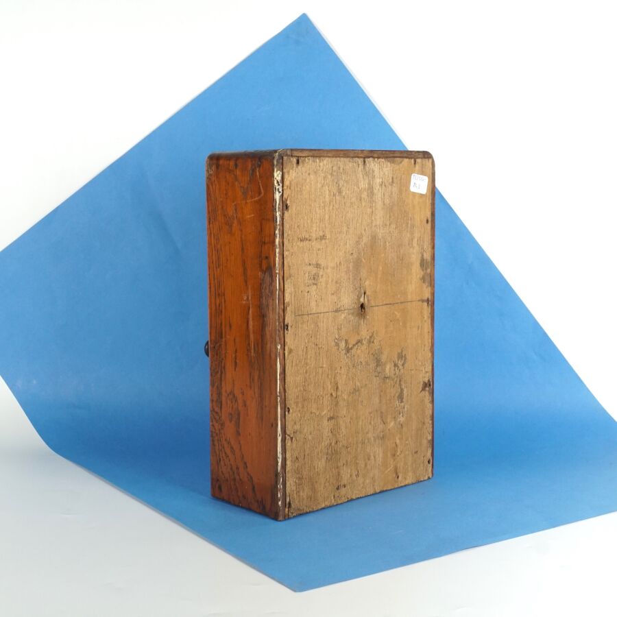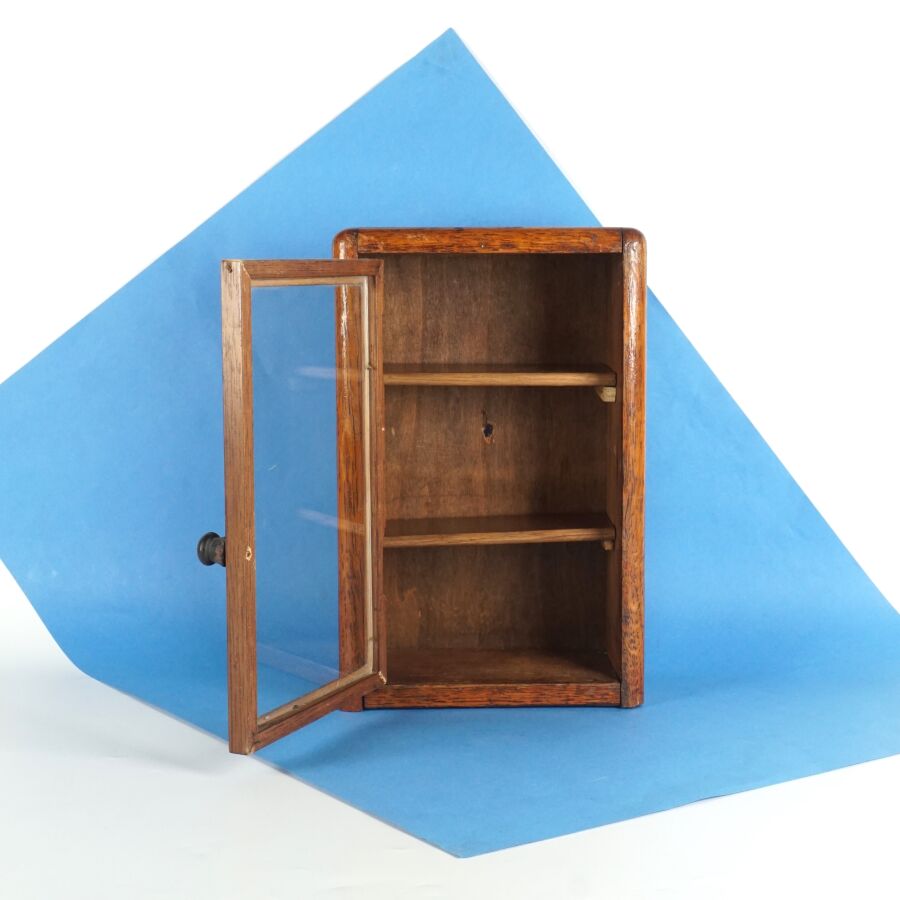Petite vitrine en bois ouvrant à un vantail vitré, découvrant deux étagères, travail rustique, H. 30.5 cm, L : 19.5 cm, P : 10 cm (en l'état).
