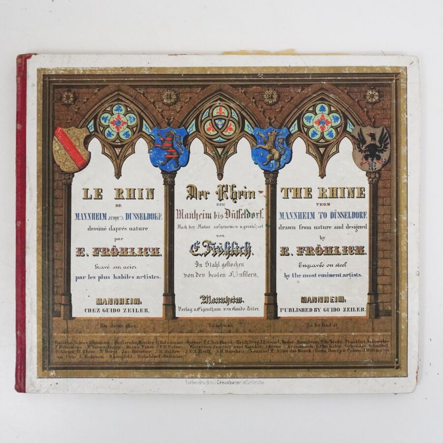 PHOTO Allemagne - FRÖHLICH (E.). Le Rhin de Mannheim jusqu'à Dusseldorf. Mannheim, Guido Zeiler, sd [c. 1850]. In-4 oblong cartonnage illustré en couleurs, dos rouge (cartonnage de l'éditeur). Frottés.