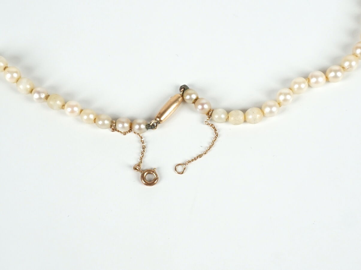 PHOTO Collier de perles disposées en chute, 3 à 7 mm environ, fermoir olive à cliquet et chaine de sécurité en or jaune 18K (750/oo), L. 56 cm (usures). Poids brut : 20.5 g environ.