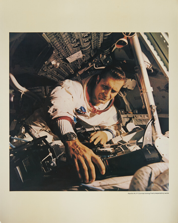 [PHOTOGRAPHIE - MONTRE OMEGA] - Coffret commémoratif de la mission Apollo XI édité par la manufacture Omega, [vers 1970] - 1 volume In-folio en feuilles sous étui illustré de cratères de la lune - Texte introductif sous chemise à rabat portant les signatures des astronautes d'Apollo XI en fac-similé et l'intitulé : " Pour commémorer le plus sensationnel exploit de tous les temps, qui a fait d'Omega la première montre portée sur la lune, Omega dédie ce coffret-souvenir à ses amis " - 14 grandes photos couleurs montrant les différentes étapes de l'expédition spatiale, sur la photographie d'Aldrin, prise par Armstrong, apparait la montre Omega Speedmaster Professional - Bon exemplaire.