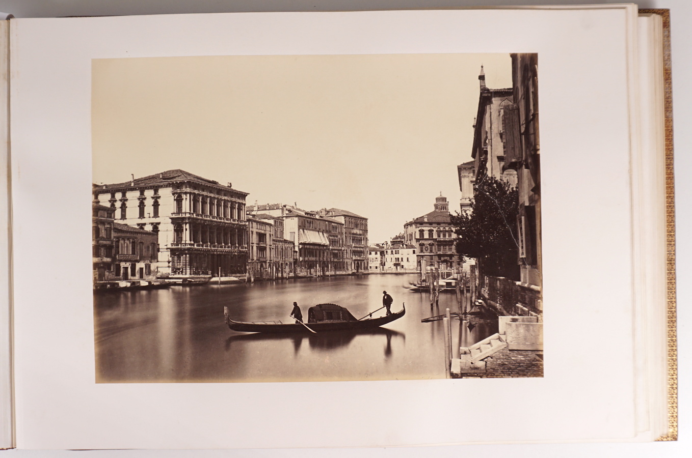 [PHOTOGRAPHIES - ITALIE] - 1 album In-folio oblong titré Souvenirs de voyage 1872 en lettres frappées à froid au 1er plat et surmontées d'1 couronne - 33 photographies de format cm contre collées sur feuillets de papier fort montés sur onglets, présentant des monuments des villes de Rome, Florence, Venise et Pise, certaines vues sont animées - Reliure de l'époque maroquin roux, plats encadrés à froid sur aies de bois dans étui de carton (endommagé) - Dentelle intérieure dorée - Dos à nerfs muet orné à froid - Tranches dorées - Bel exemplaire.