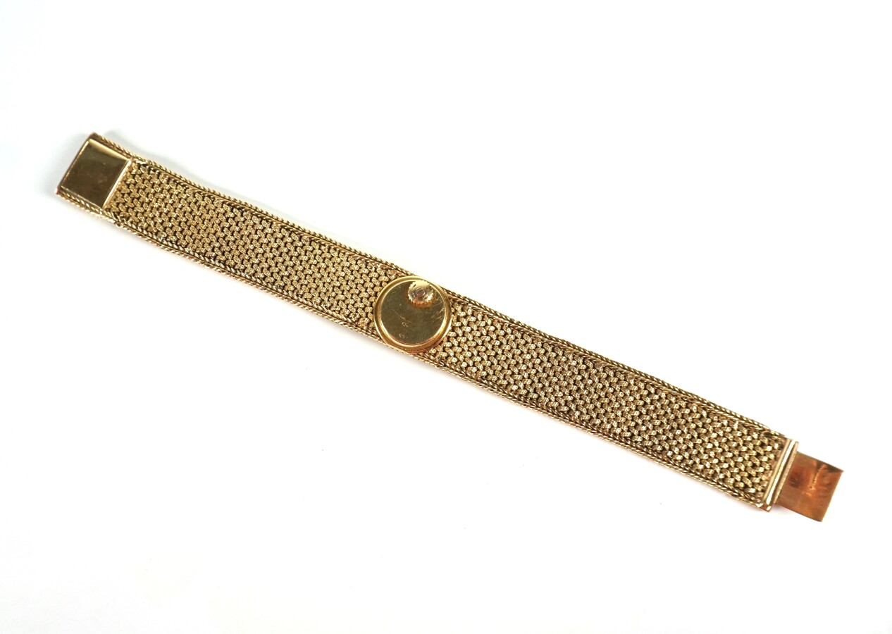 PIAGET : Montre de dame "Ruban" en or de 2 tons 18K (750/oo), boitier rond serti d'une ligne de petits diamants ronds, cadran irisé à index, remontoir au-dessous, mouvement mécanique à remontage manuel, bracelet bandeau maille tressée, fermoir à cliquet. Tour de poignet : 17.8 cm (un maillon fendu et possibles traces de restauration au niveau du côté du bracelet proche du fermoir). Poids brut : 58.7 g environ.