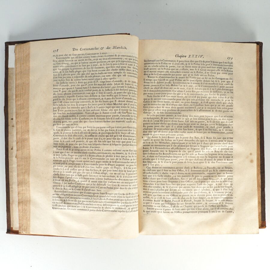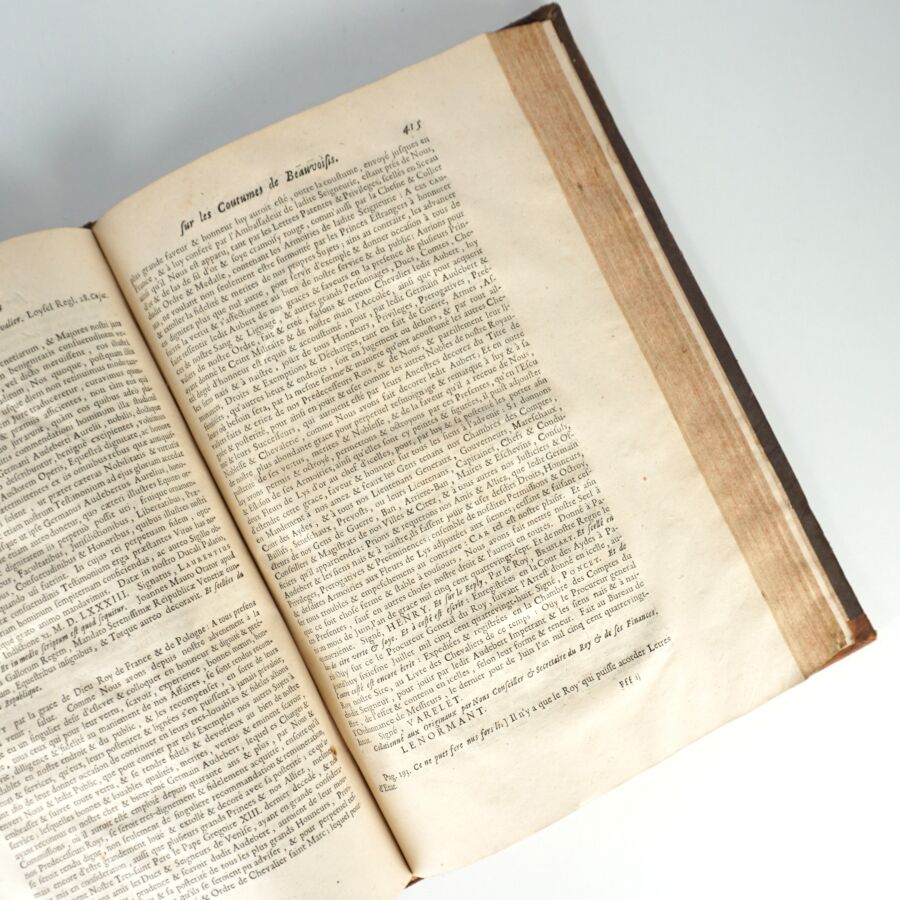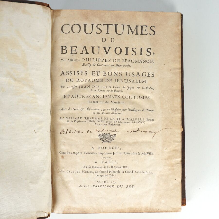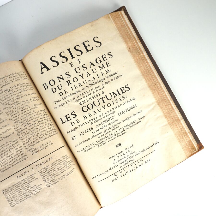 Picardie - BEAUMANOIR (Philippe de) & IBELIN (Jean d') & THAUMAS DE LA THAUMASSIERE (Gaspard). Coustumes de Beauvoisis, par Messire Philippe de Beaumanoir [...] Assises et bons usages du Royaume de Jérusalem par Jean d'Ibelin [...] et autres anciennes coutumes, le tout tiré des manuscrits, avec des notes & observations, & un Glossaire [...] par Gaspard Thaumas de la Thaumassière. Bourges, François Toubeau, Paris, L. Billaine, Jacques Morel, 1690. Grand in-4 basane mouchetée (reliure ancienne très restaurée, dos entièrement refait). [6] ff., 514 pp., [4] ff., 292 pp. Qqs petites restaurations de papier.