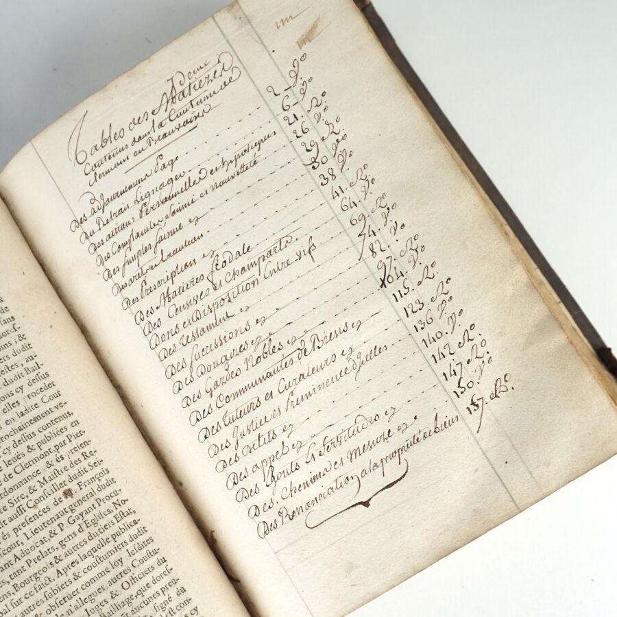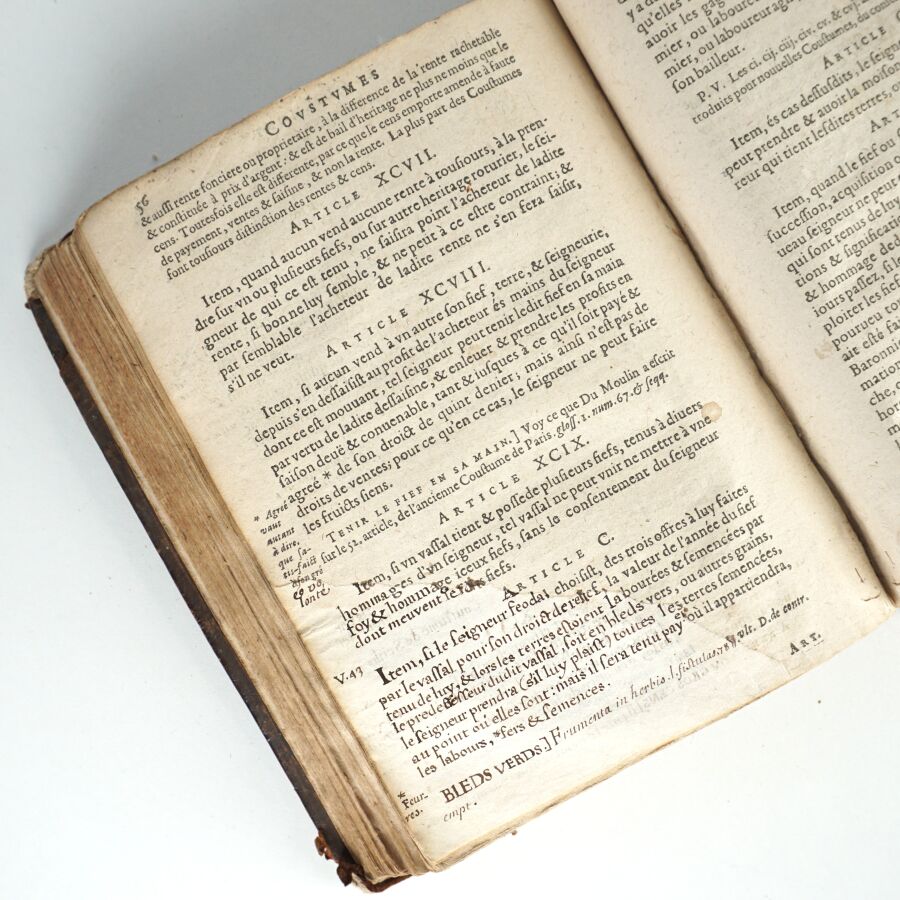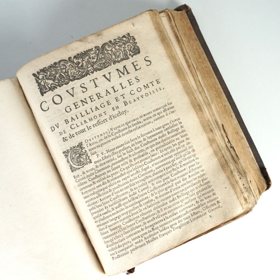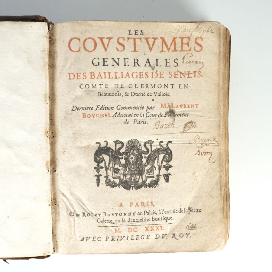 Picardie - BOUCHET (Laurent). Les Coustumes générales des bailliages de Senlis, comté de Clermont en Beauvoisis, & Duché de Vallois. Paris, Rolet Boutonné, 1631. 3 parties en un fort volume petit in-4 basane brune, dos à nerfs orné (reliure de l'époque). Reliure très usagée. Nombreuses marques d'appartenance manuscrites sur les gardes et au titre.