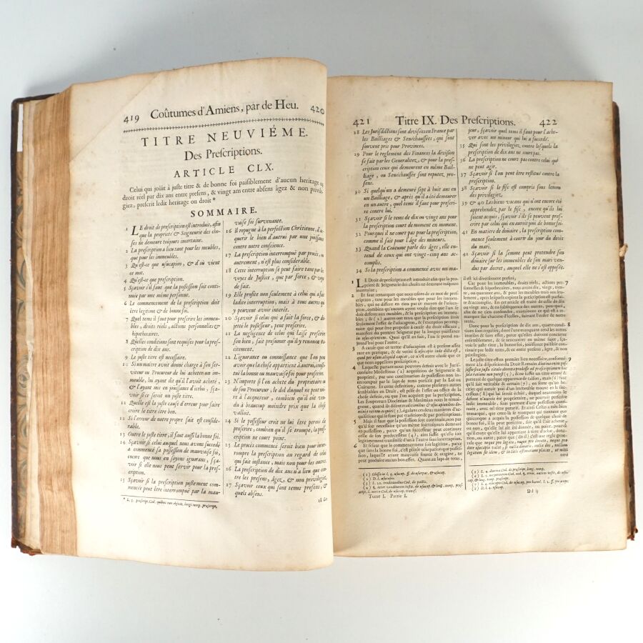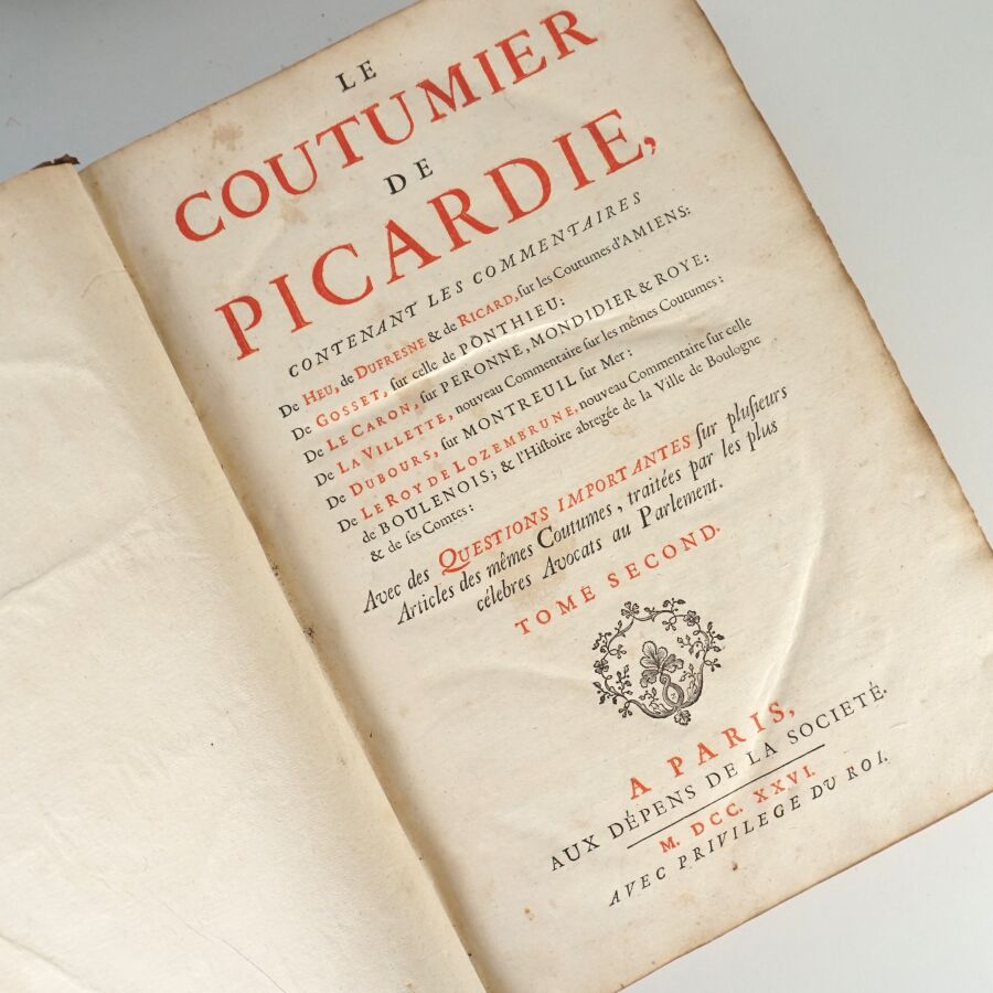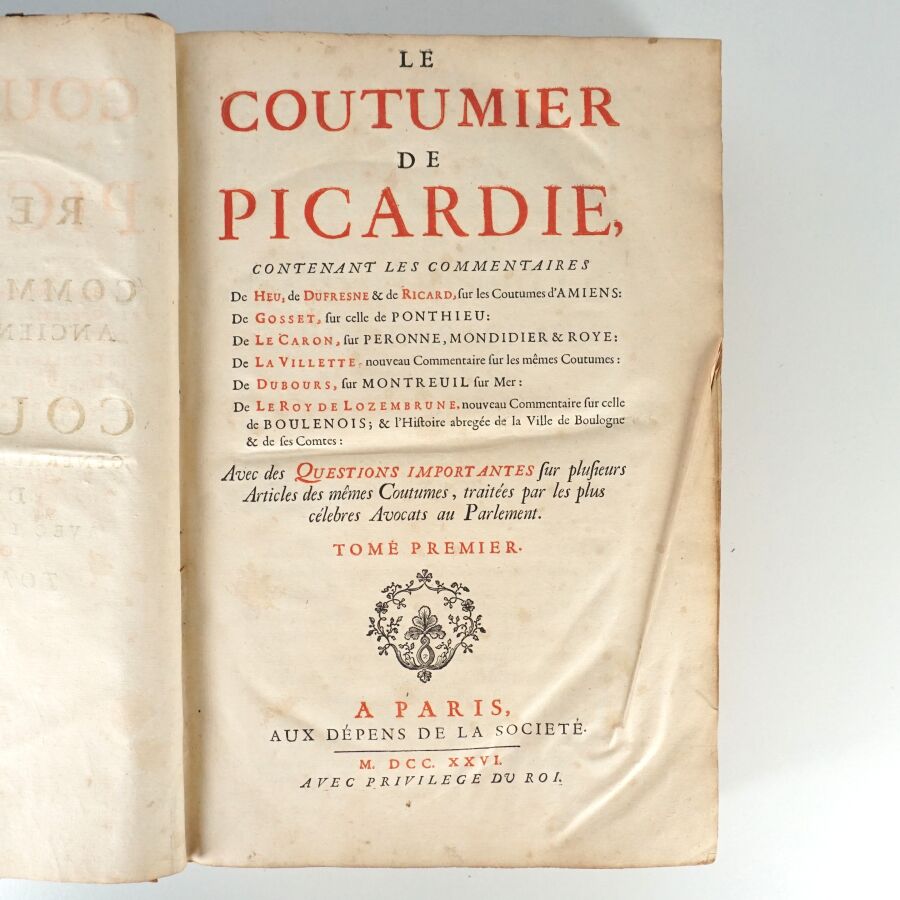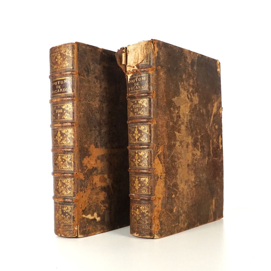 Picardie. Le Coutumier de Picardie, contenant les commentaires de Heu, de Dufresne & de Ricard sur les coutumes d'Amiens ; de Gosset, sur celle de Ponthieu ; de Le Caron, sur Peronne, Mondidier & Roye ; de La Villette, nouveau commentaire sur les mêmes coutumes ; de Dubours, sur Montreuil sur Mer ; de Le Roy de Lozembrune, nouveau commentaire sur celle de Boulenois ; & l'histoire abrégée de la ville de Boulogne et de ses comtes [...] Paris, aux dépens de la Société, 1726. 2 forts volumes in-folio basane brune, dos à nerfs orné (reliure de l'époque). Importants frottés et épidermures.