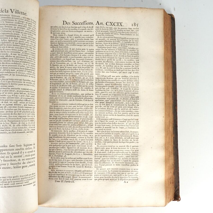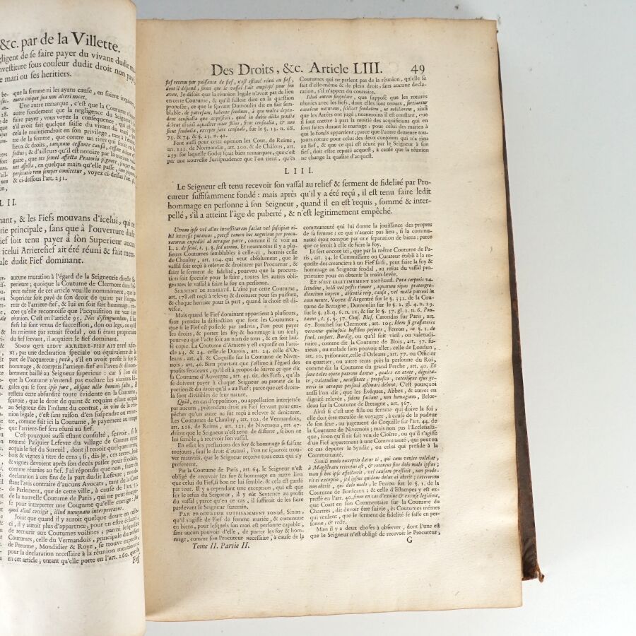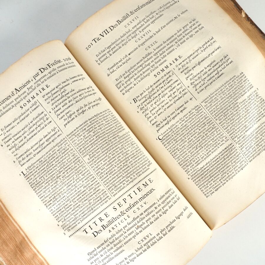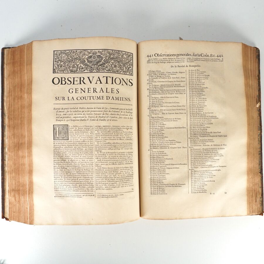 Picardie. Le Coutumier de Picardie, contenant les commentaires de Heu, de Dufresne & de Ricard sur les coutumes d'Amiens ; de Gosset, sur celle de Ponthieu ; de Le Caron, sur Peronne, Mondidier & Roye ; de La Villette, nouveau commentaire sur les mêmes coutumes ; de Dubours, sur Montreuil sur Mer ; de Le Roy de Lozembrune, nouveau commentaire sur celle de Boulenois ; & l'histoire abrégée de la ville de Boulogne et de ses comtes [...] Paris, aux dépens de la Société, 1726. 2 forts volumes in-folio basane brune, dos à nerfs orné (reliure de l'époque). Importants frottés et épidermures.