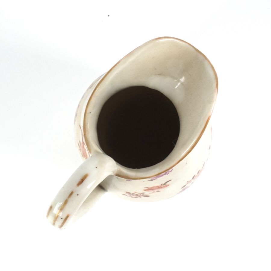 Pichet en porcelaine et émaux de la famille rose, à décor d'armoirie anglaise parmi des jetées de fleurs surmontée d'une devise latine " Auspicio Regis et senatus angliae " (sous l'auspice du Roi et du Parlement d'Angleterre) Chine, Compagnie des Indes, fin du 18ème siècle, H. 20.5 cm.