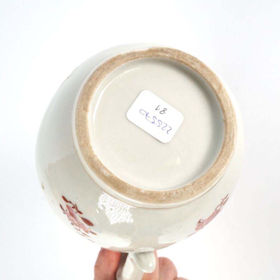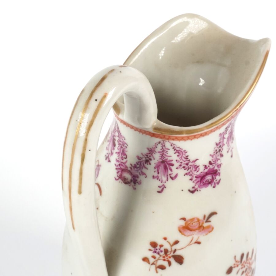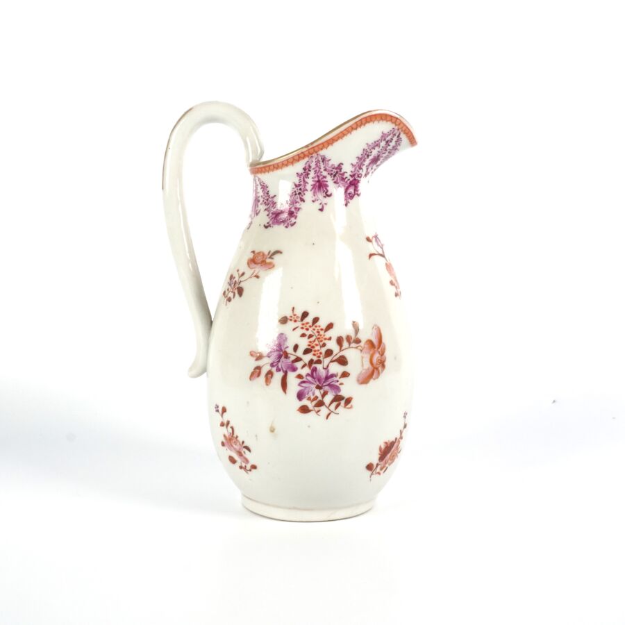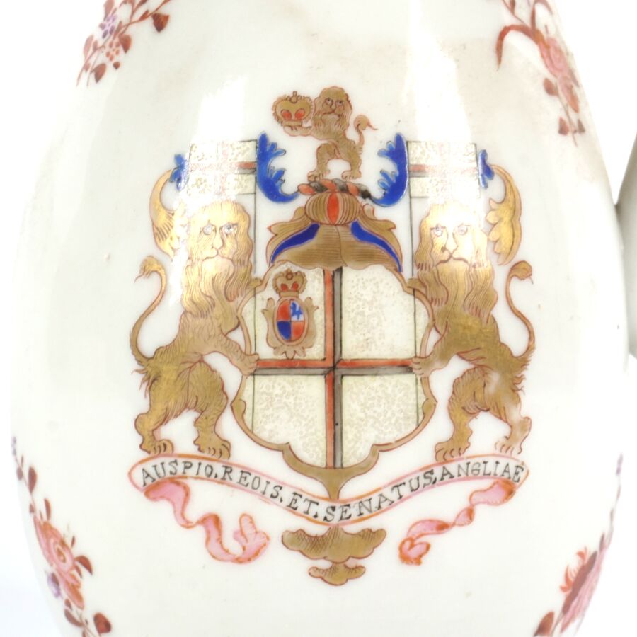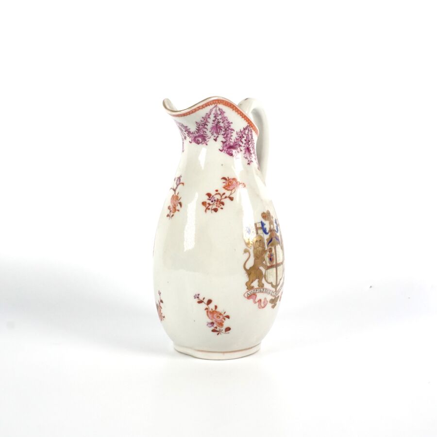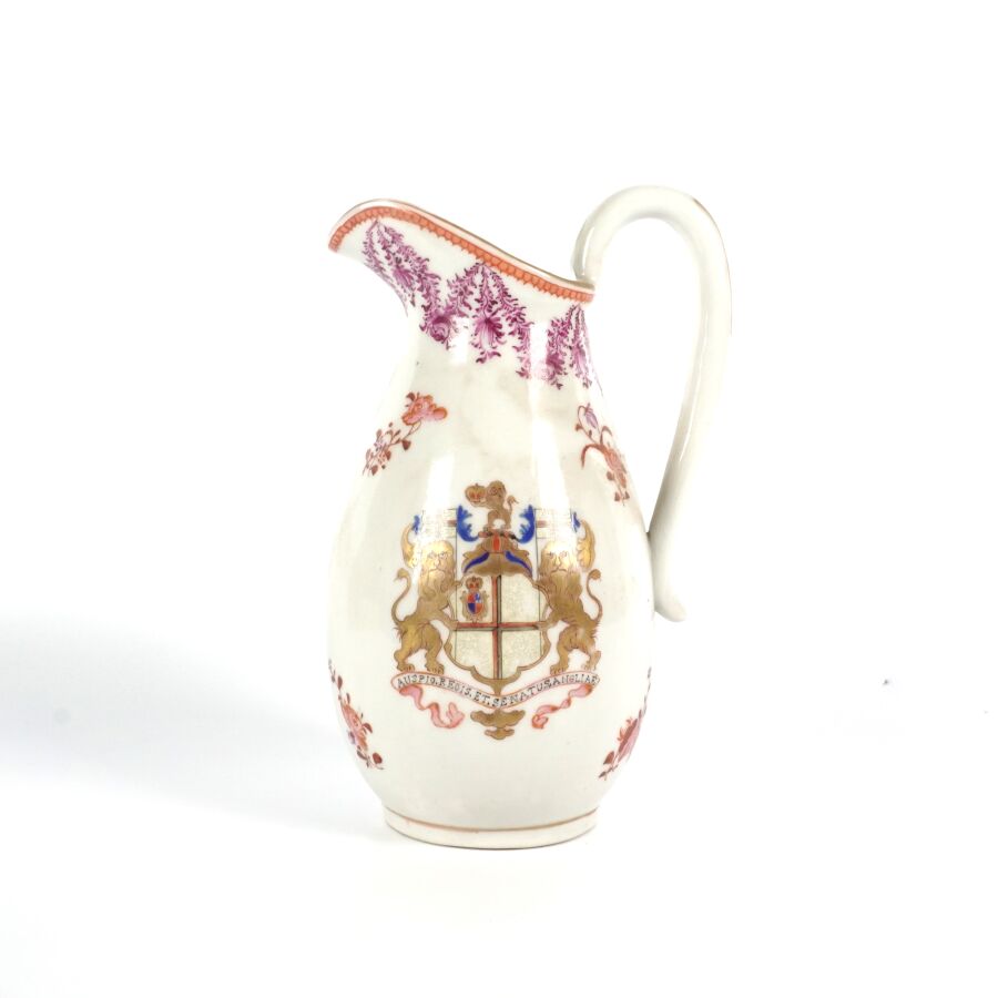Pichet en porcelaine et émaux de la famille rose, à décor armoirié parmi des jetées de fleurs surmontée d'une devise latine " Auspicio Regis et senatus angliae " (sous l'auspice du Roi et du Parlement d'Angleterre) Chine, Compagnie des Indes pour l'Angleterre, fin du 18ème siècle, H. 20.5 cm.
