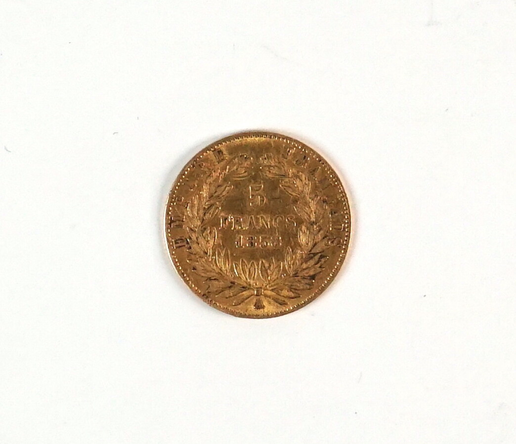 Pièce 5 Fr or Napoléon III Empereur "tête nue", 1858 A. Poids brut : 1.6 g environ.