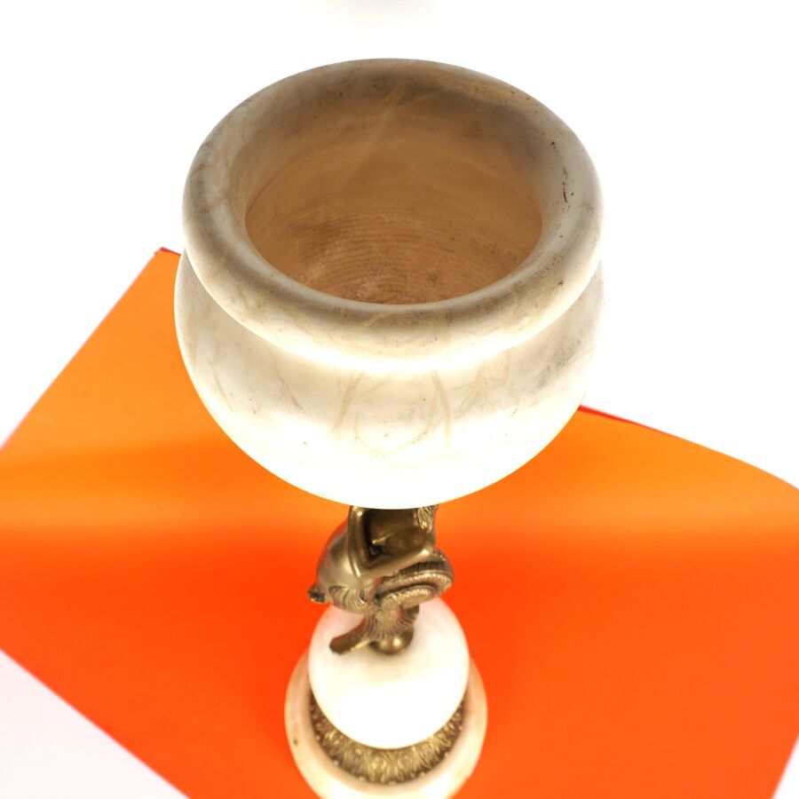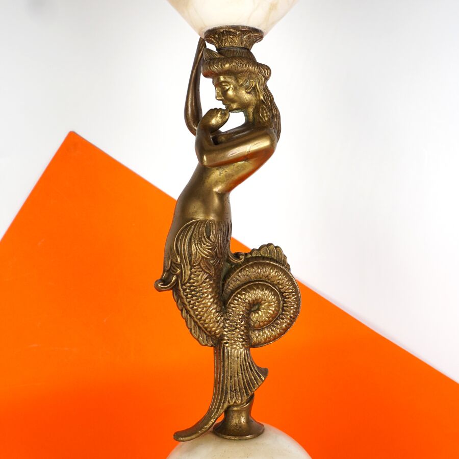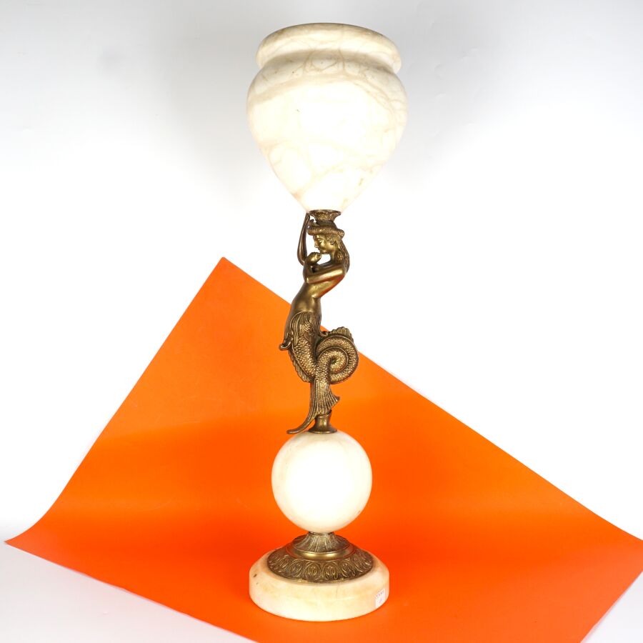 Pied de lampe à fût en bronze doré et albâtre à décor d'une sirène sur un oeuf, circa 1950, H. 60 cm.