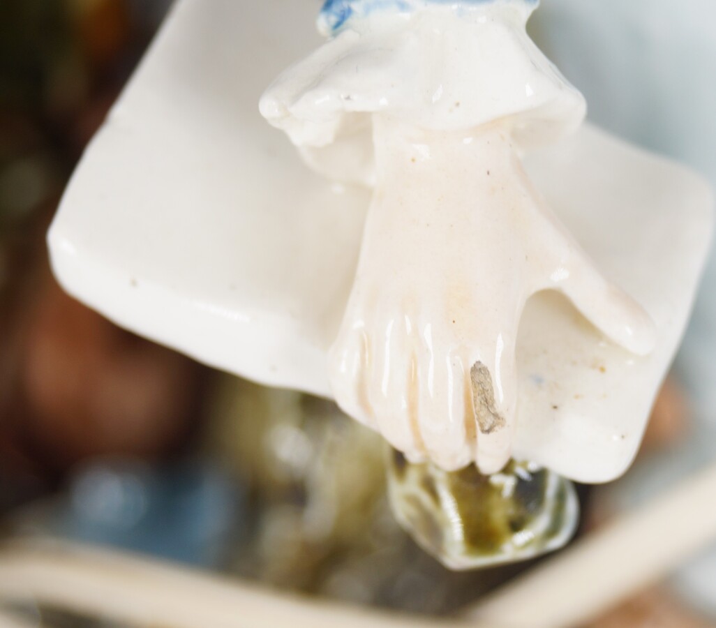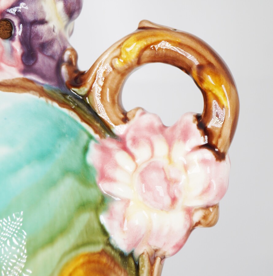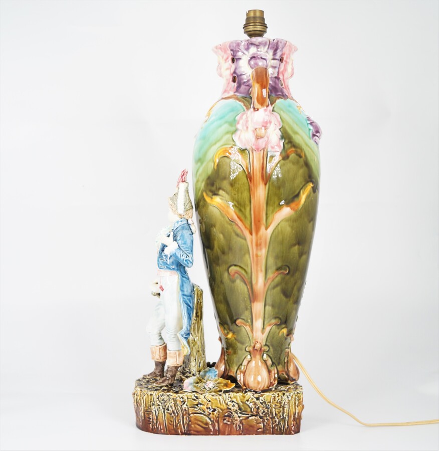 Pied de lampe en barbotine à décor d'un homme galant tenant un livre au pied d'un vase fleuri à deux anses agrémentées de fleurs, H. 50 cm (quelques égrenures, légers éclats aux doigts).