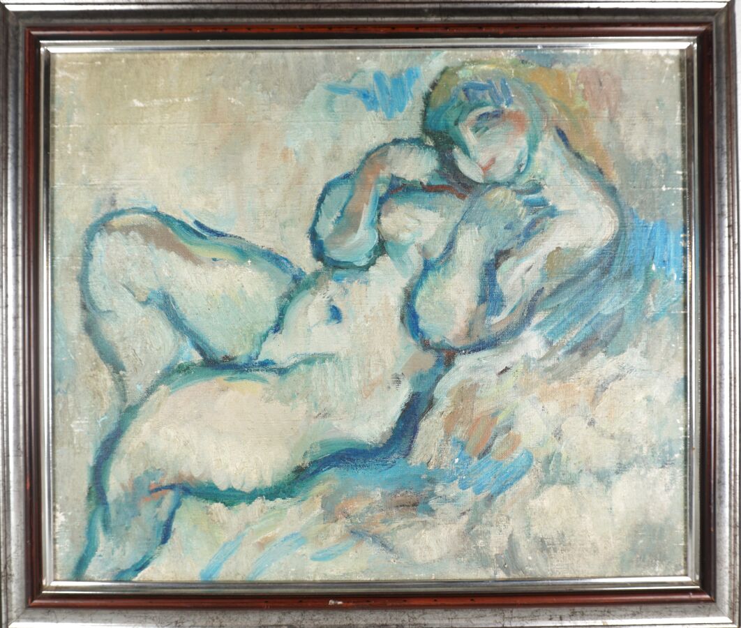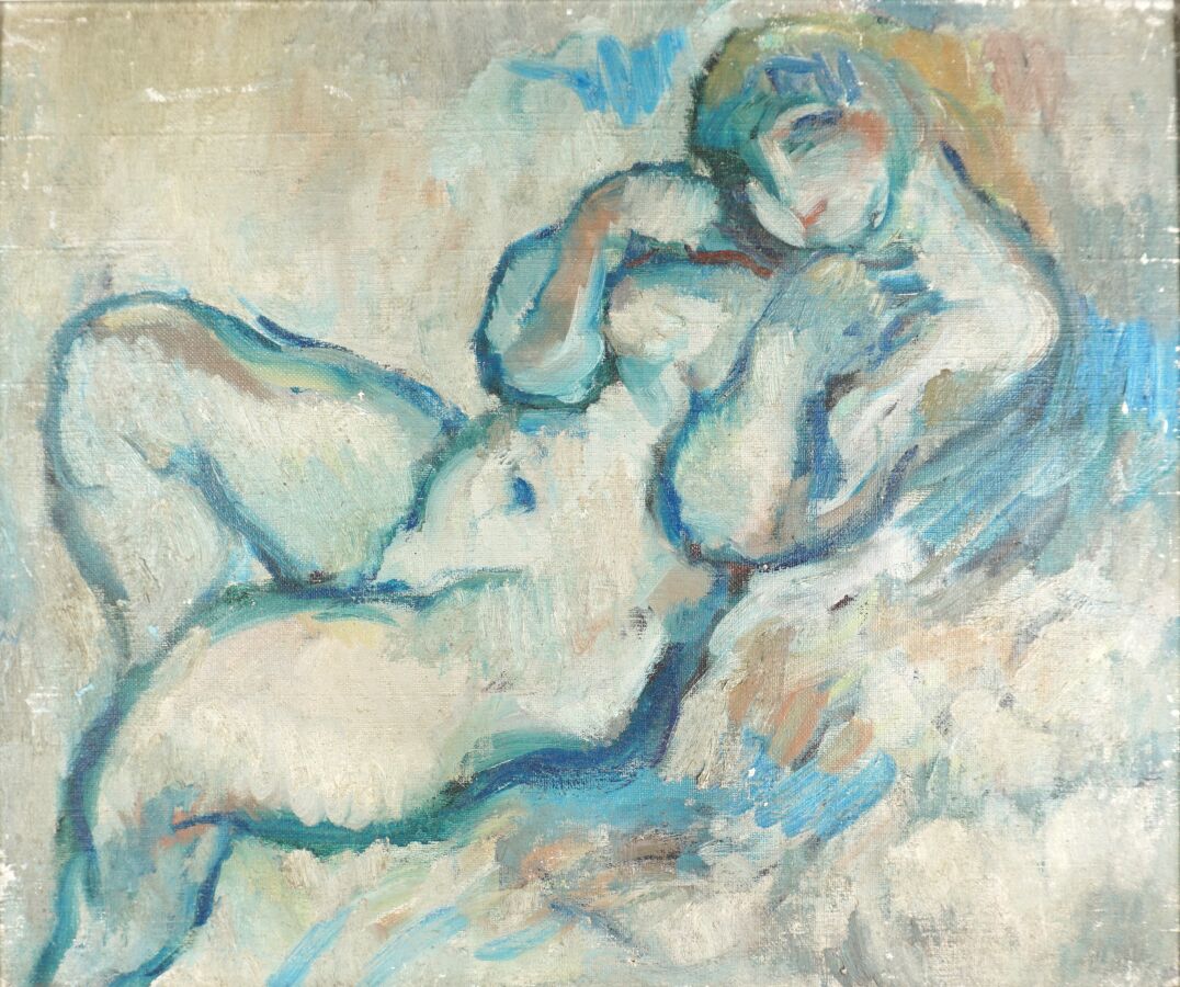 Pierre Albert GENOLHAC (1896-1964), "Nu féminin", huile sur toile, cachet de cire au revers de la toile, numérotée au dos, 46 x 55 cm (écaillures, manques).