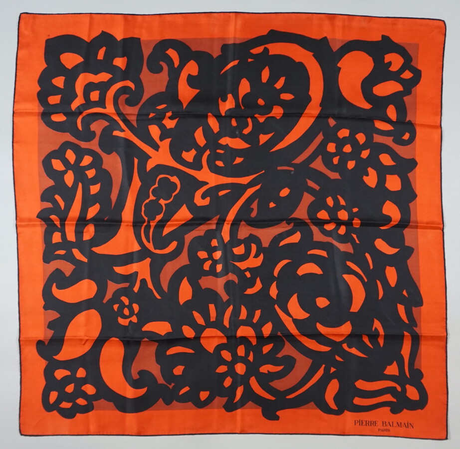 Pierre BALMAIN : Carré de soie imprimé, à décor de rinceaux noirs sur fond orangé, 75 x 75 cm environ (petites taches).