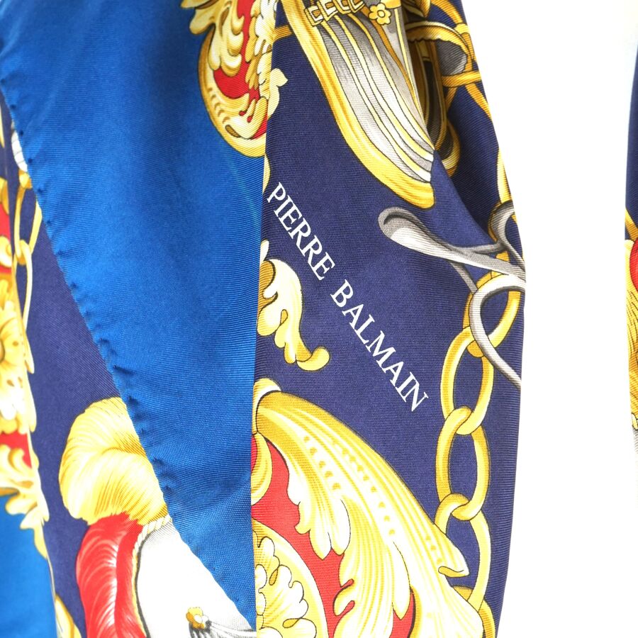 Pierre BALMAIN : Carré de soie, motif chevaleresque rouge et or sur fond bleu, signé, 90 x 90 cm environ (légères traces).