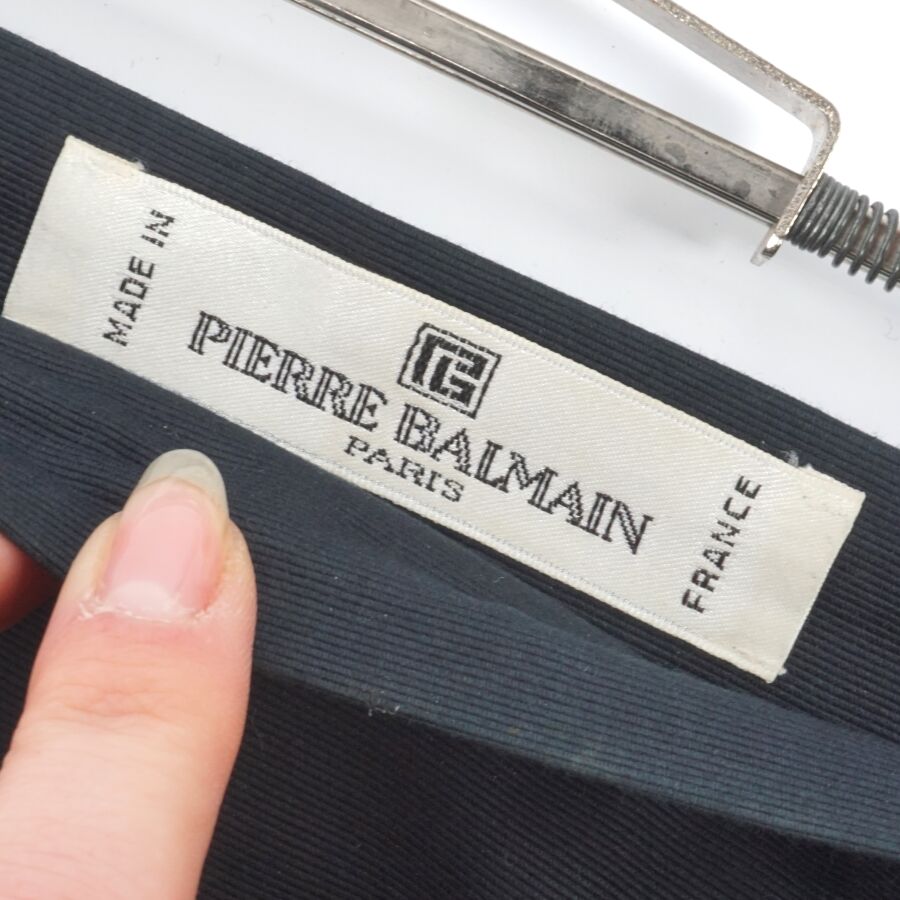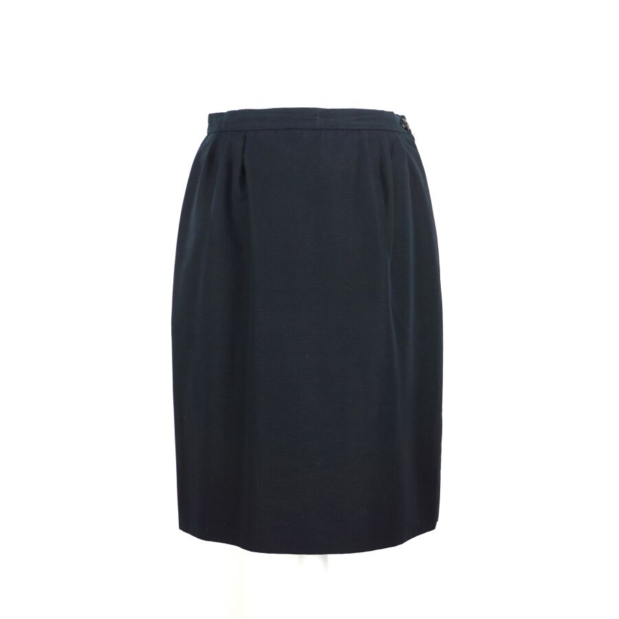 PIERRE BALMAIN : Jupe droite en laine bleu nuit, fermeture latérale à la taille par un bouton et une fermeture zippée, deux poches latérales, doublure en polyester noir, petite fente arrière, L. 59 cm. Larg. Taille : 36 cm (petites usures).