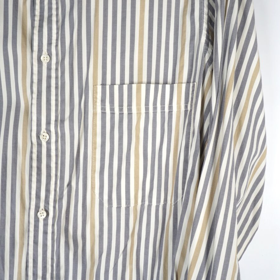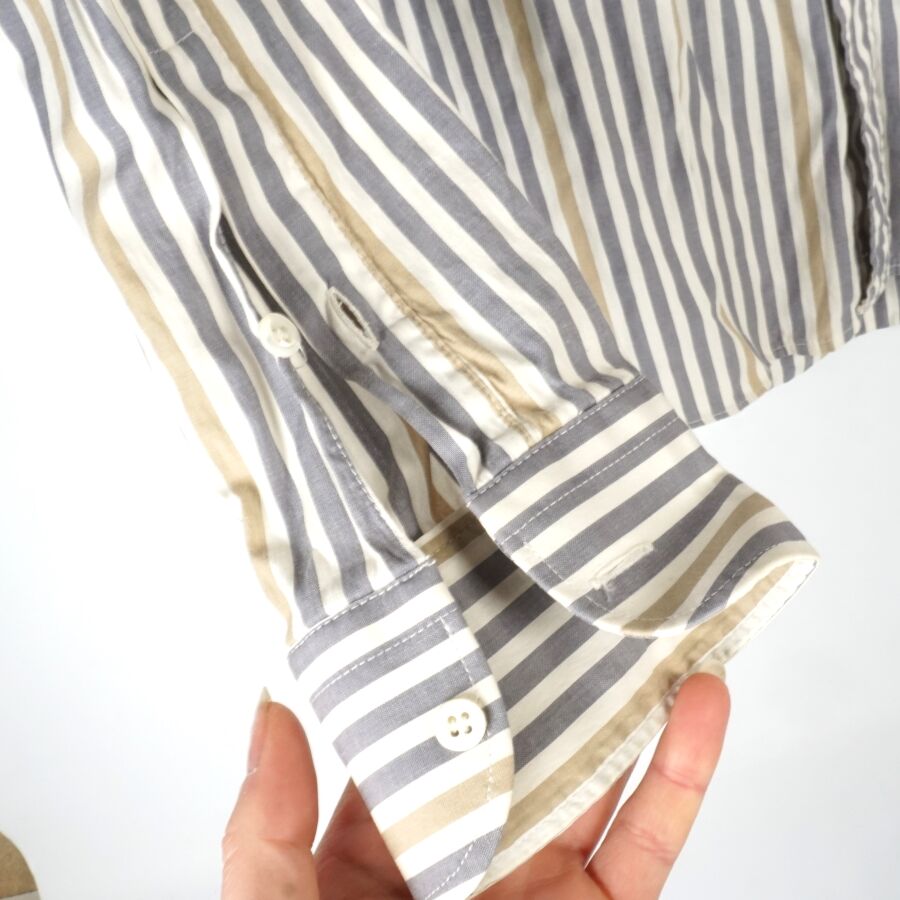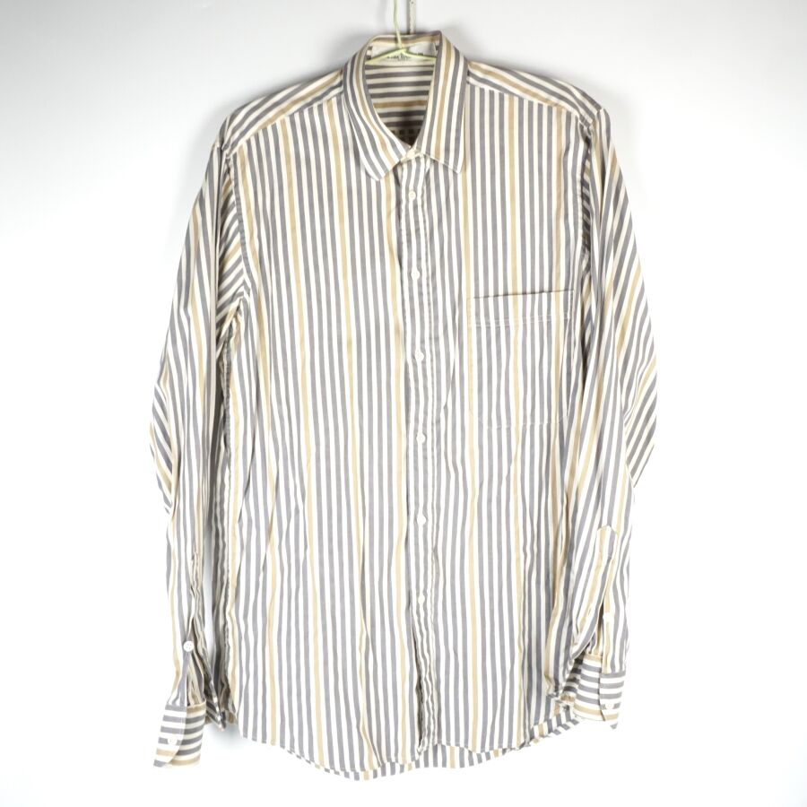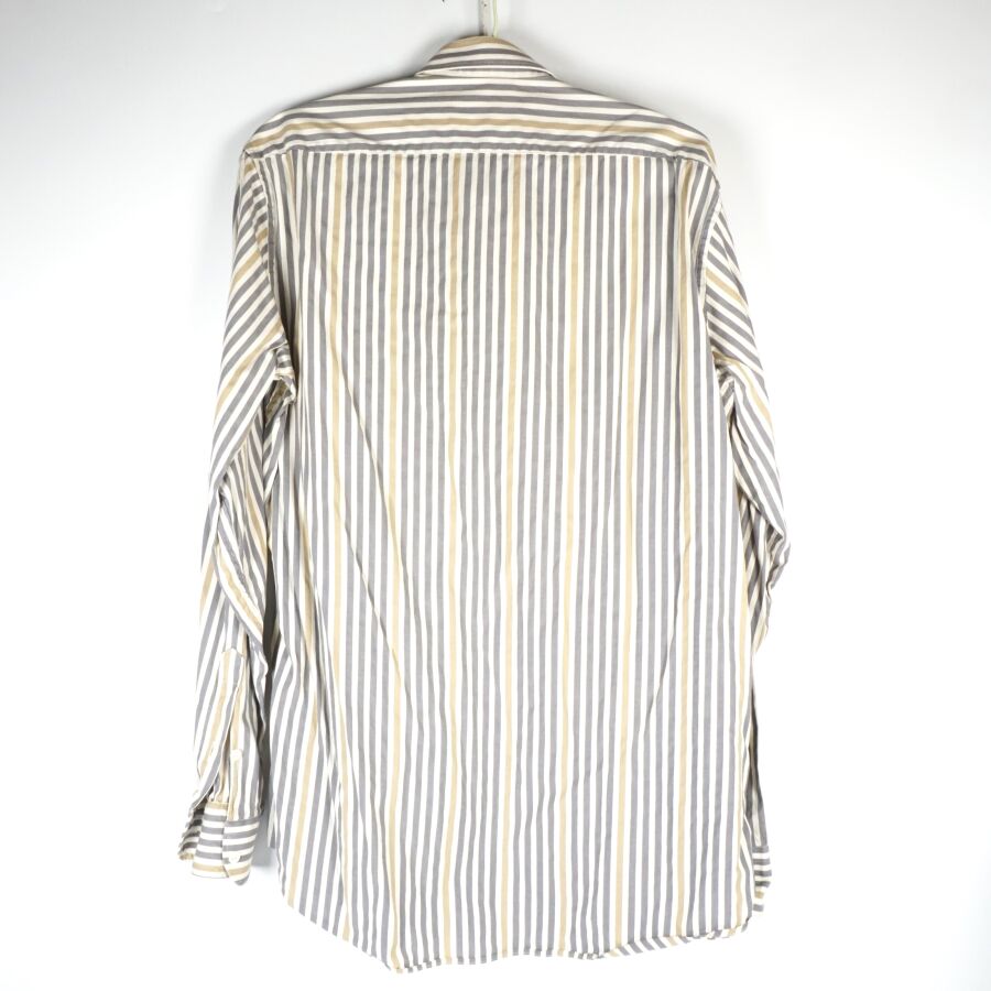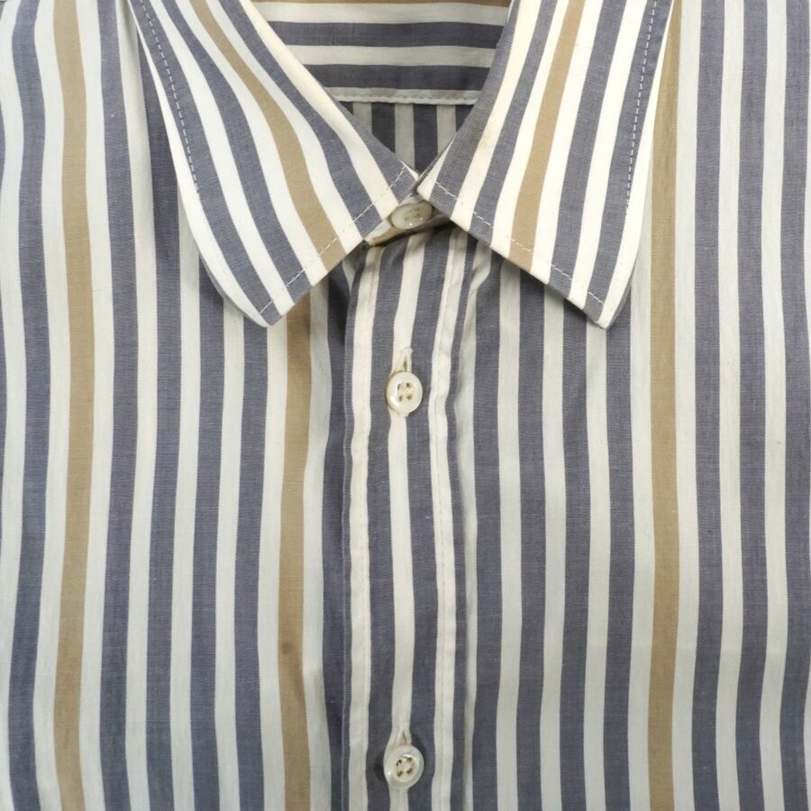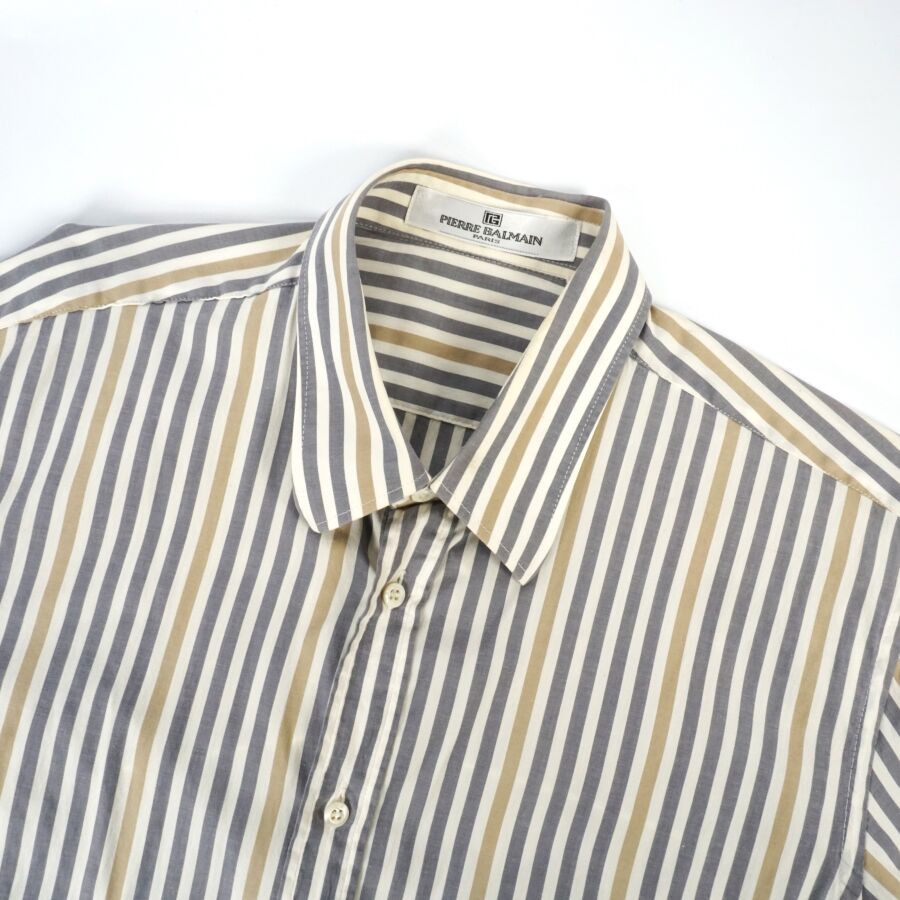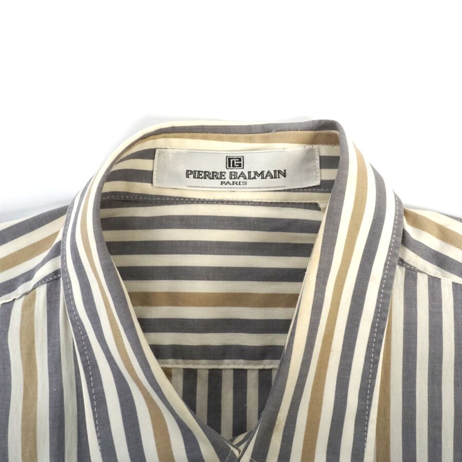 PIERRE BALMAIN - PARIS : Chemise en coton de couleur blanche à rayures vert et bleu-gris, fermeture à l'avant par six boutons nacrés, manches longues avec fermeture à l'extrémité par un bouton, poche extérieure haute, étiquette intérieure, indication 39, L. Totale : 79 cm environ (très légères petites usures).