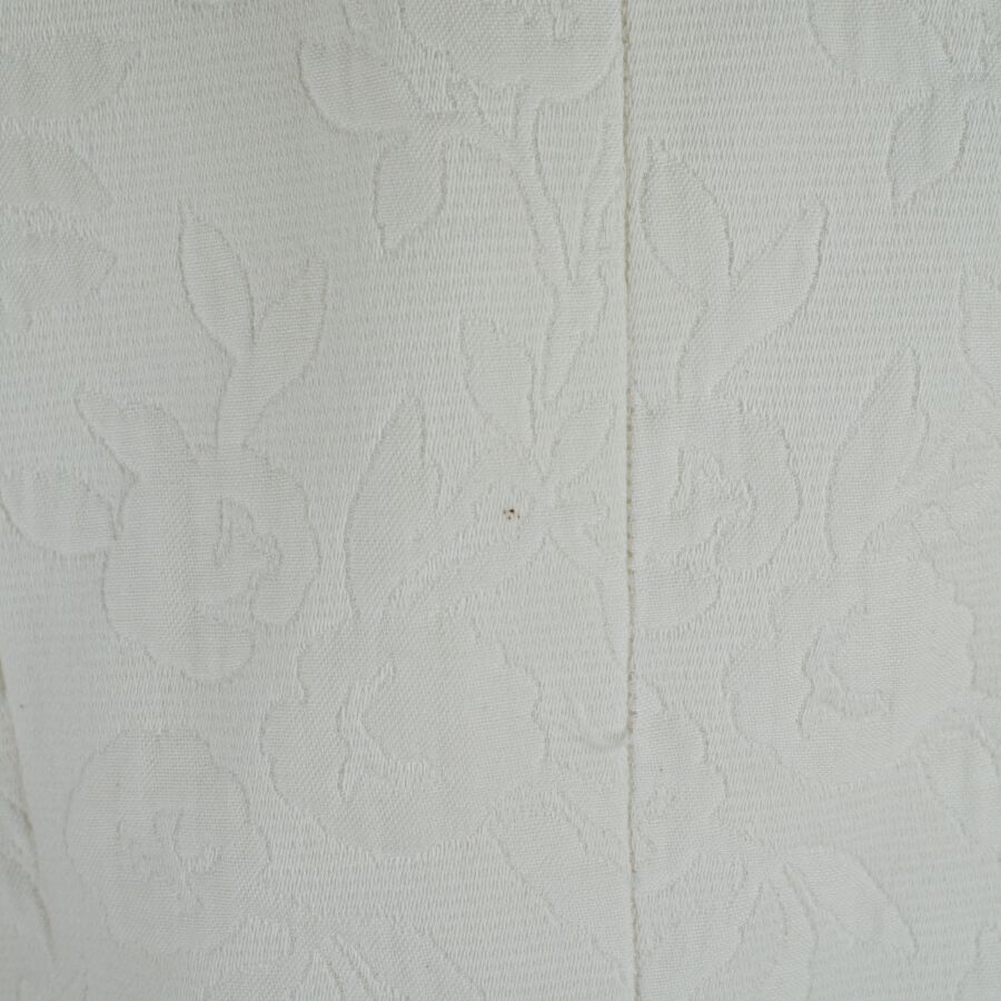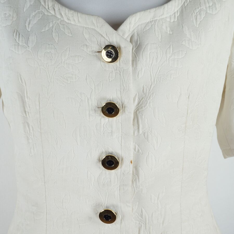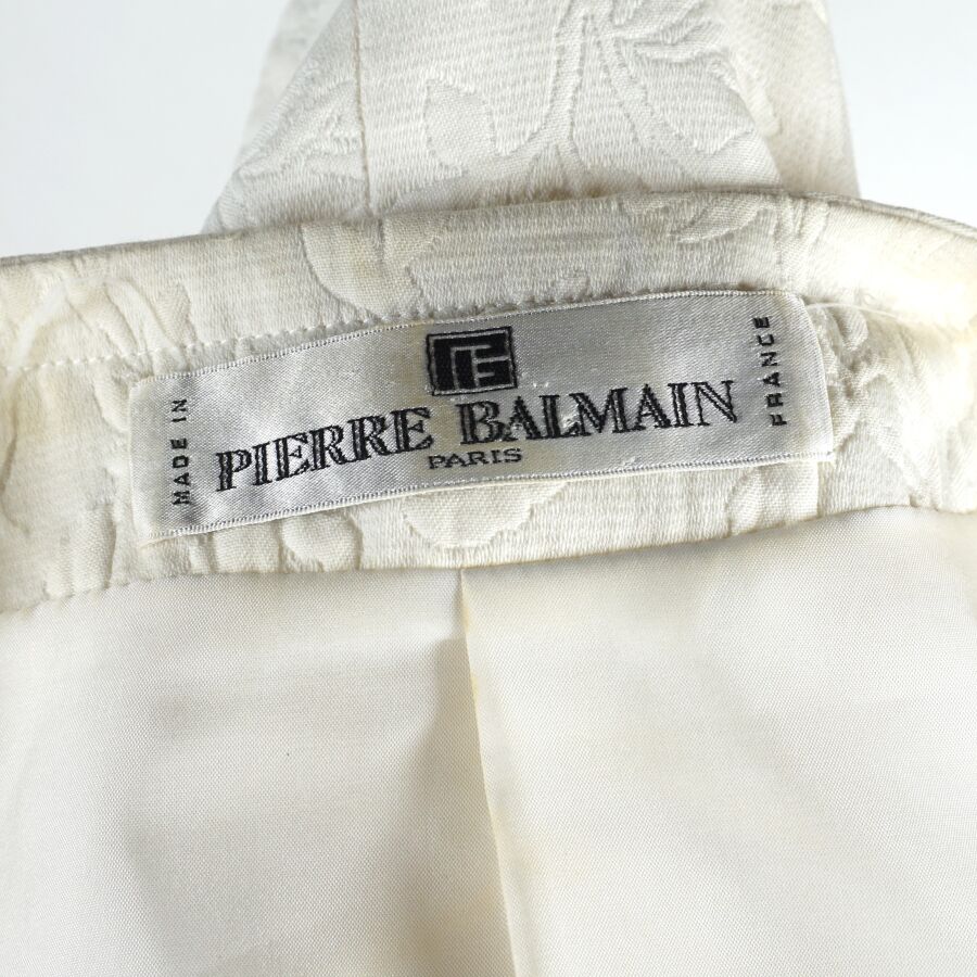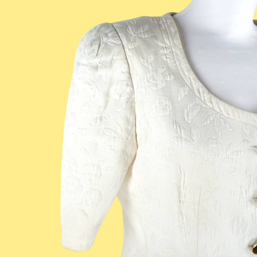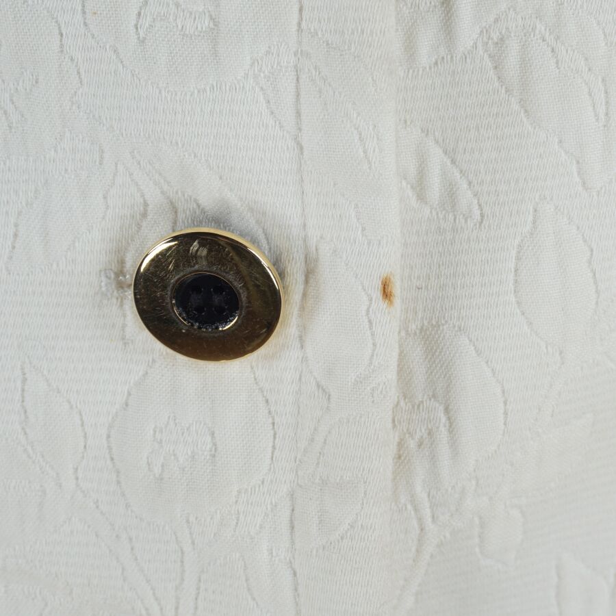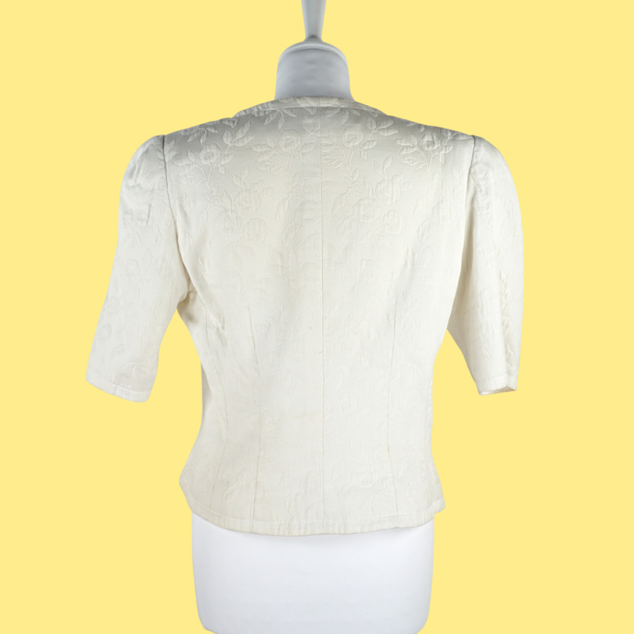 PIERRE BALMAIN - PARIS : Élégante veste en coton et polyamide crème - écru à motif floral ton sur ton, col rond, fermeture à l'avant par quatre boutons dorés et noirs, manches courtes légèrement bouffantes aux épaules, étiquette intérieure, taille indiquée 42, taille supposée M, H. Totale : 50 cm (petites taches).