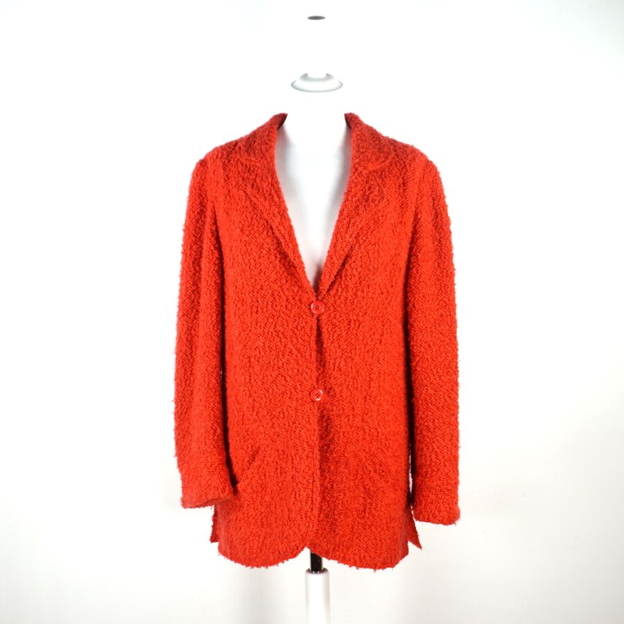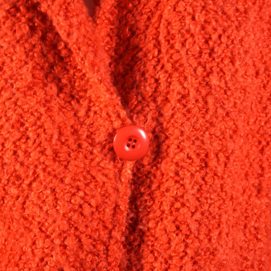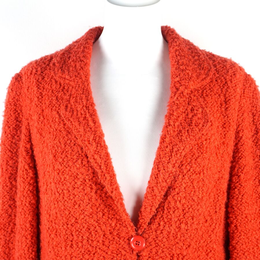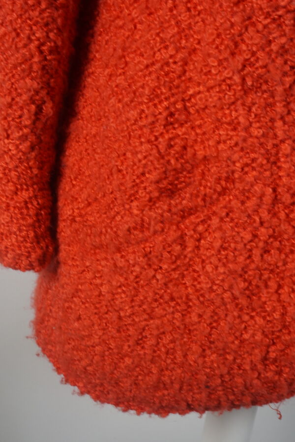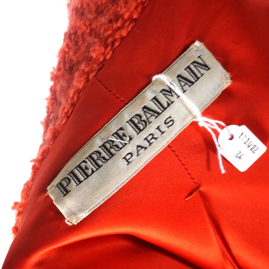 PIERRE BALMAIN : Veste longue style blazer en laine bouclée corail-rouge, fermeture à deux boutons laqués rouges, double intérieure en soie rouge, étiquette, deux poches externes, taille supposée M, L. Totale : 78 cm. Larg. Epaules : 48 cm environ (petits fils tirés).