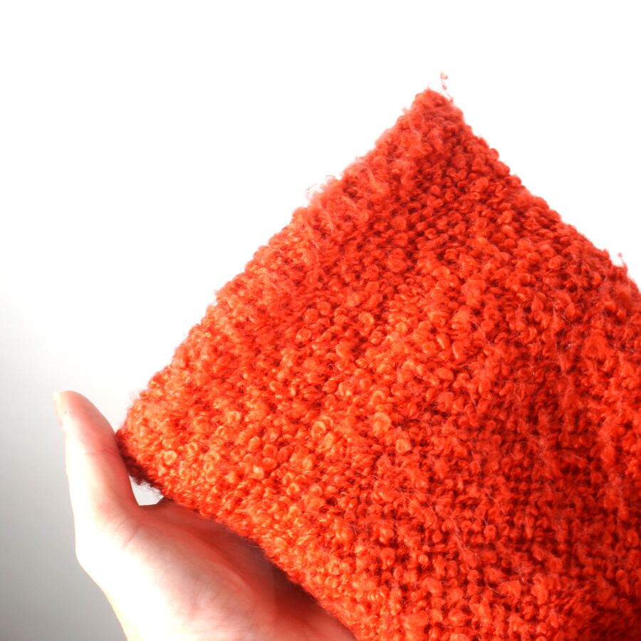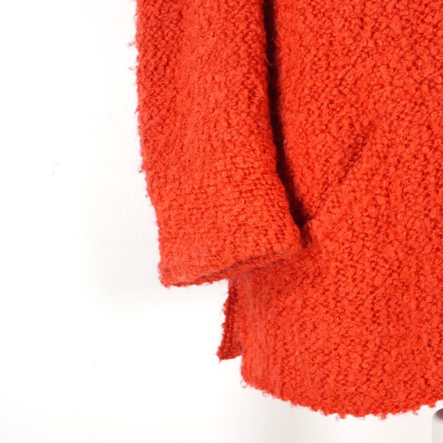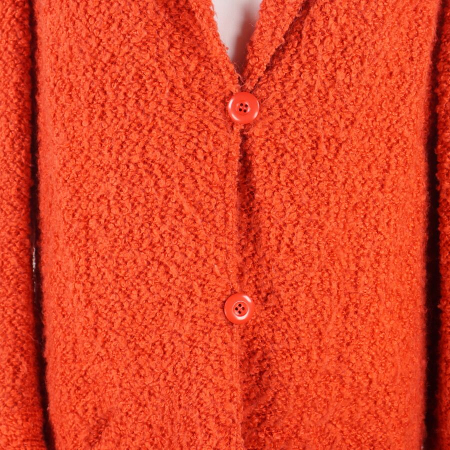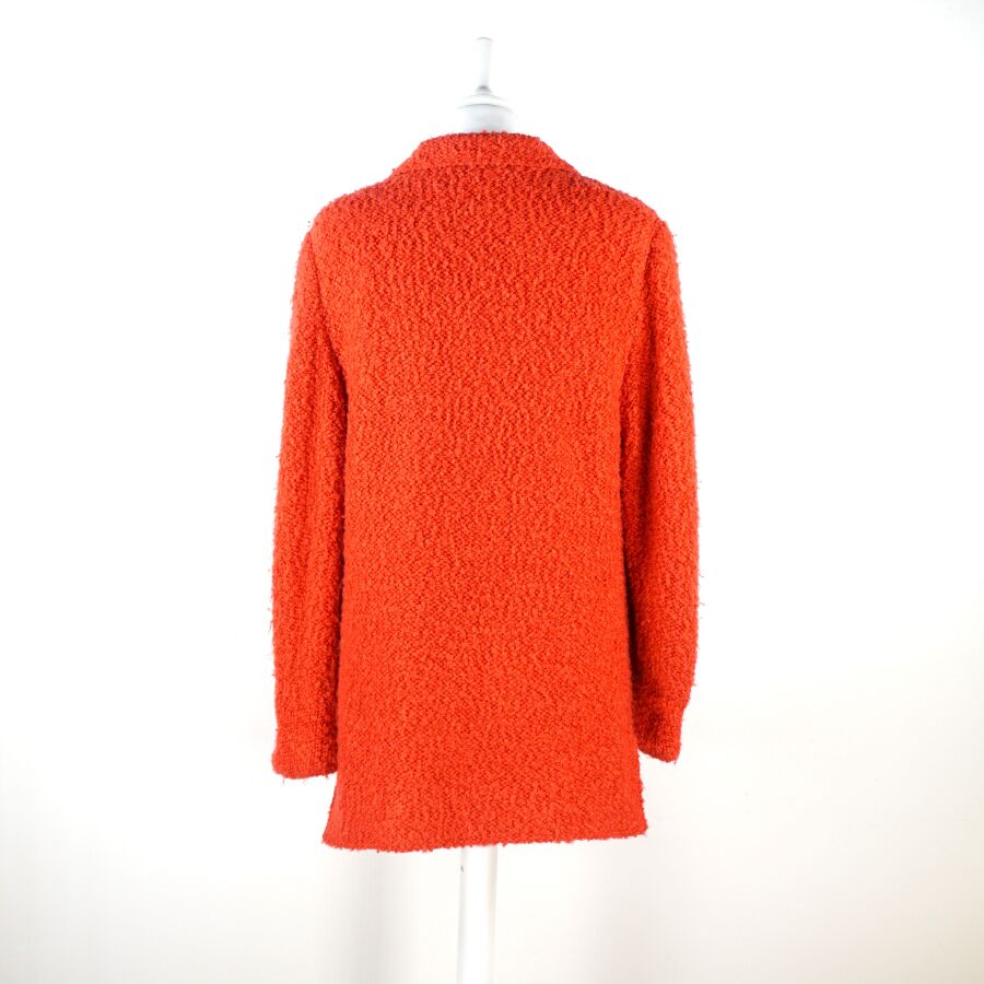 PIERRE BALMAIN : Veste longue style blazer en laine bouclée corail-rouge, fermeture à deux boutons laqués rouges, double intérieure en soie rouge, étiquette, deux poches externes, taille supposée M, L. Totale : 78 cm. Larg. Epaules : 48 cm environ (petits fils tirés).