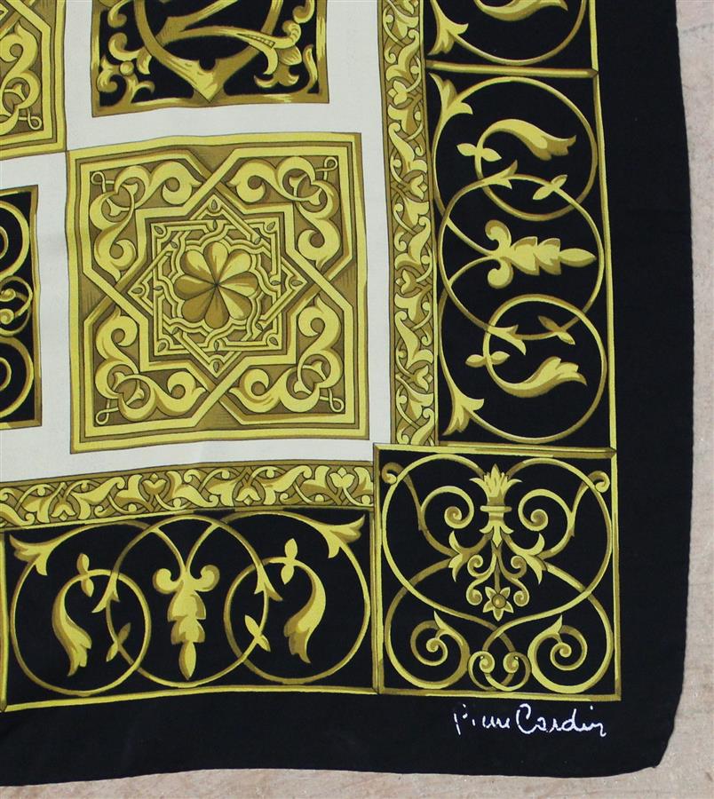 Pierre CARDIN : Carré en mousseline de soie, à décor d'arabesques or, marge noire, 85 x 85 cm (très petites taches)