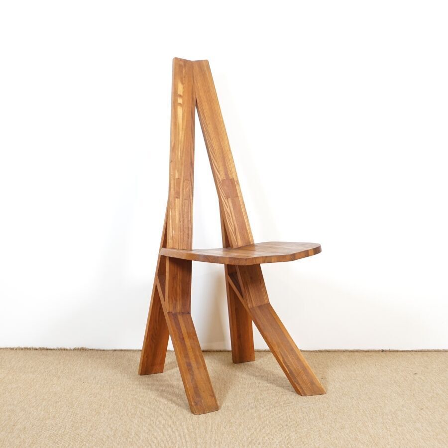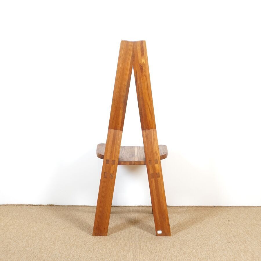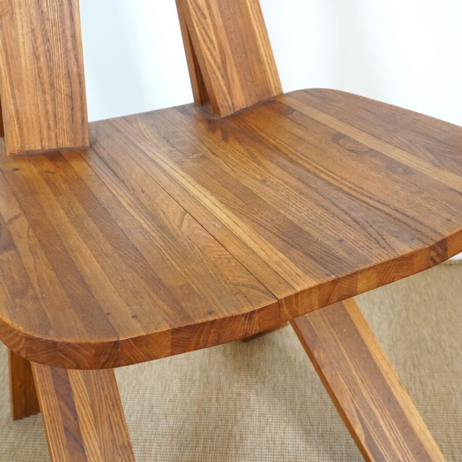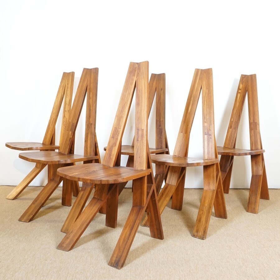 Pierre CHAPO (1927-1986) : Suite de six chaises en orme massif, modèle "S45 CHLACC", dossier conique ajouré, reposant sur quatre montants, modèle créé circa 1984, Dim. 106 x 43 x 48 cm et 104 x 44 x 42.5 cm (restauration sur un pied, usures d'usage, éclats, légères fragilités et fendaisons pour quatre des chaises).