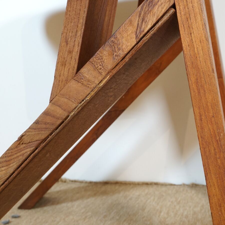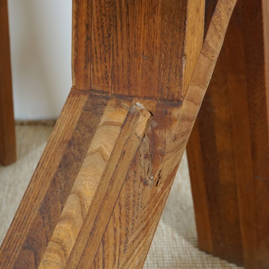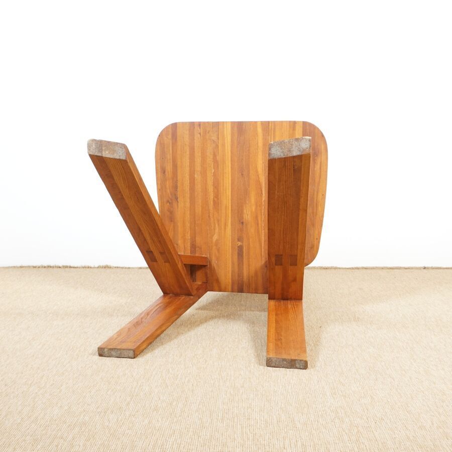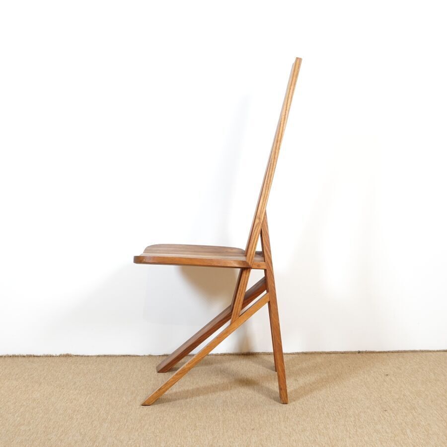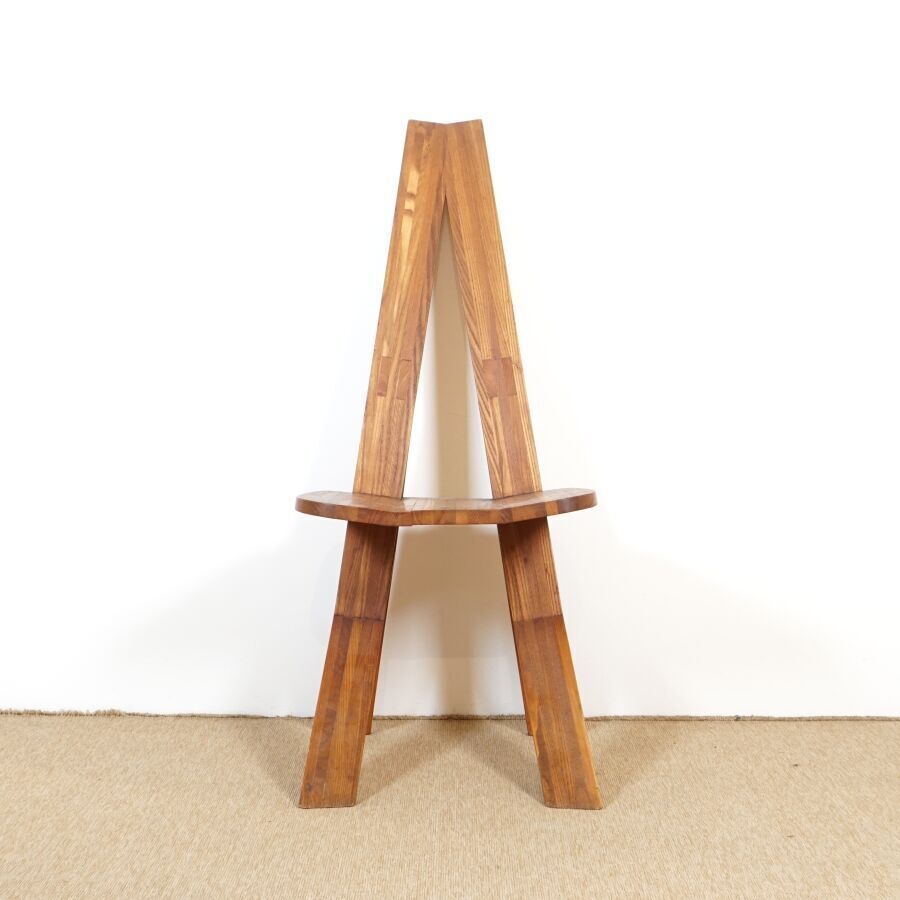 Pierre CHAPO (1927-1986) : Suite de six chaises en orme massif, modèle "S45 CHLACC", dossier conique ajouré, reposant sur quatre montants, modèle créé circa 1984, Dim. 106 x 43 x 48 cm et 104 x 44 x 42.5 cm (restauration sur un pied, usures d'usage, éclats, légères fragilités et fendaisons pour quatre des chaises).