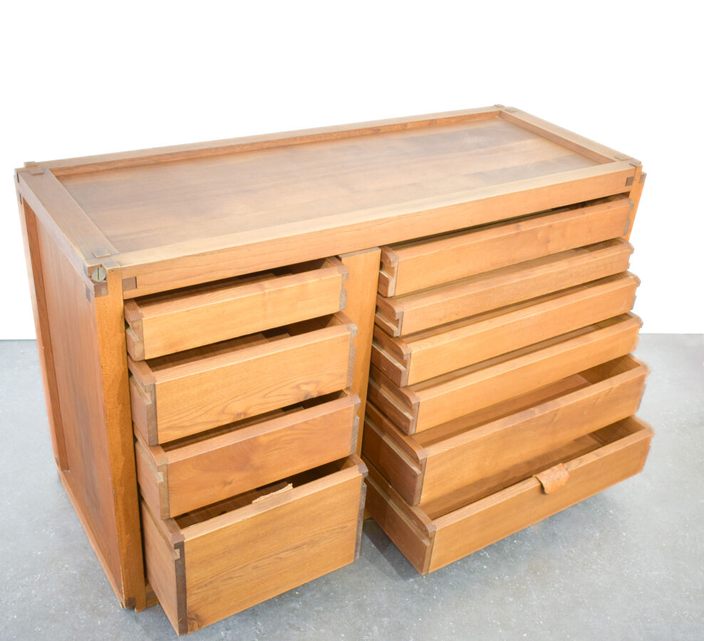 Pierre CHAPO (1927-1987) : Commode en orme massif, à corps quadrangulaire ouvrant par dix tiroirs en façade de hauteurs et longueurs différentes, Haut. 82 cm. Long. 134 cm. Larg. 82 cm.
