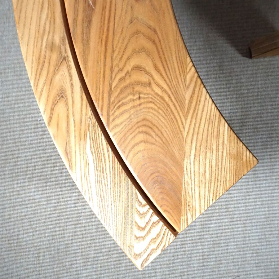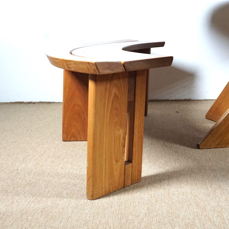 Pierre CHAPO (1927-1987) : Table modèle "SFAX T21 D" en orme massif, plateau circulaire, piétement composé de cinq éléments en faisceau, accompagnée de sa paire de bancs quart de rond modèle "S38A" en orme massif, H. Table : 71.7 cm. D. Table : 139 cm. H. Banc : 43.5 cm. L. Banc : 141 cm.