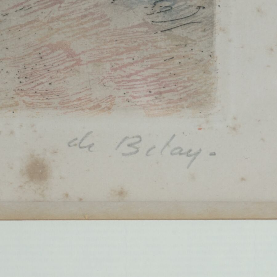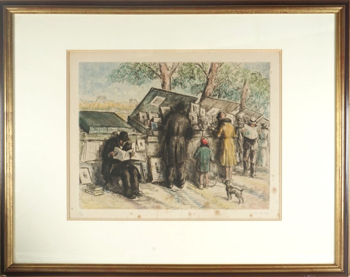 Pierre DE BELAY (1890-1947), "Les bouquinistes", lithographie en couleurs, justifiée 28/100 en bas à gauche et signée dans la marge en bas à droite, 34 x 42.5 cm (à vue) (rousseurs).
