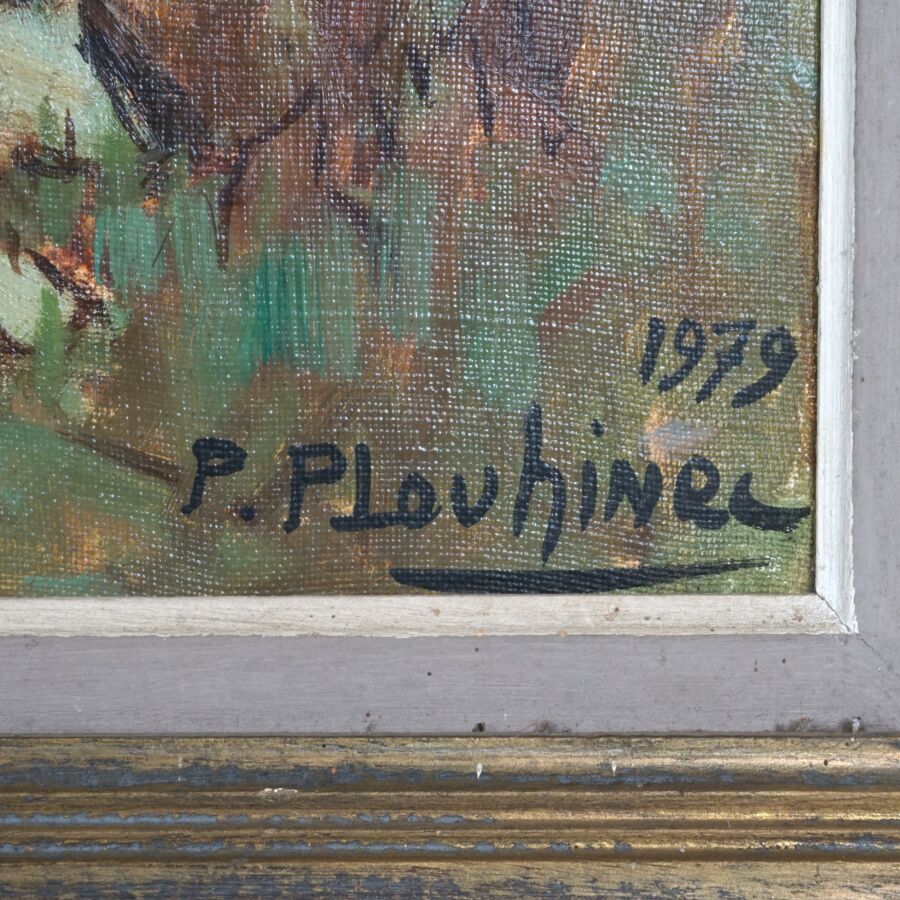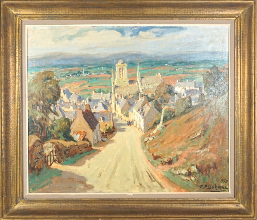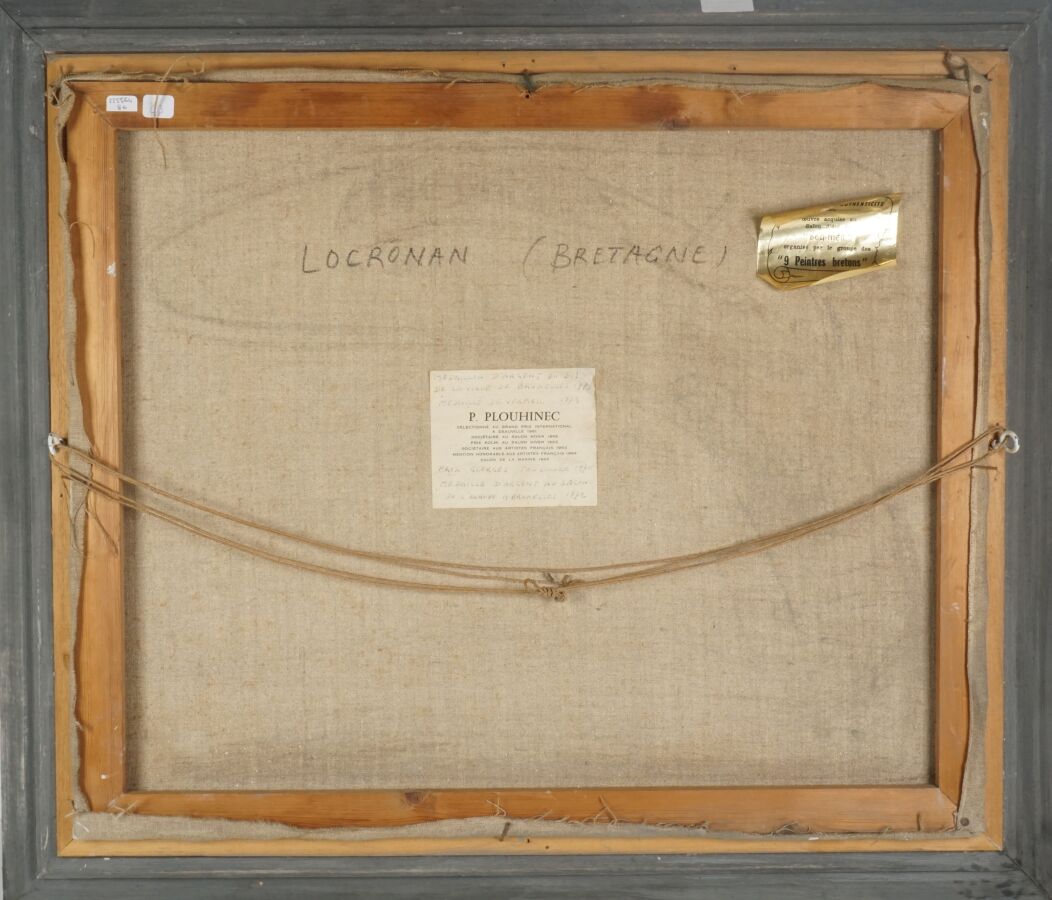 Pierre PLOUHINEC (1907-1984), "Locronan" 1979, huile sur toile signée et datée en bas à droite, située au dos, porte une étiquette "Oeuvre acquise au salon d'été de Beg-Meil organisé par le groupe 9 peintres bretons", 54 x 65.5 cm.