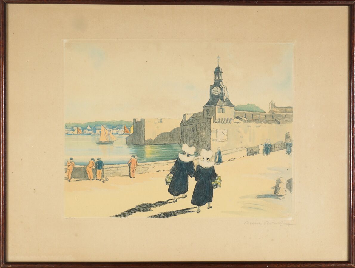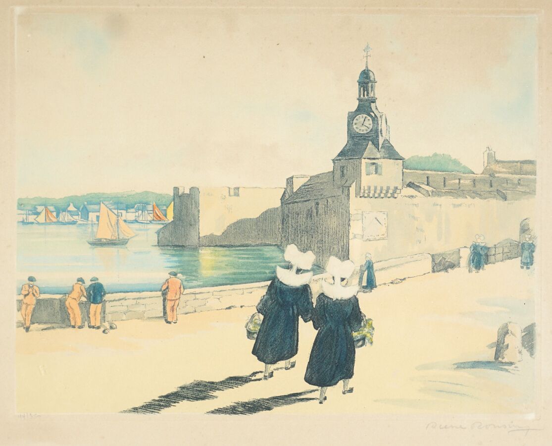 Pierre RONSIN (1922), "Bretonnes au port" ,aquatinte, signée dans la marge en bas à droite et numérotée 44/350 dans la marge en bas à gauche, 25 x 33 cm.
