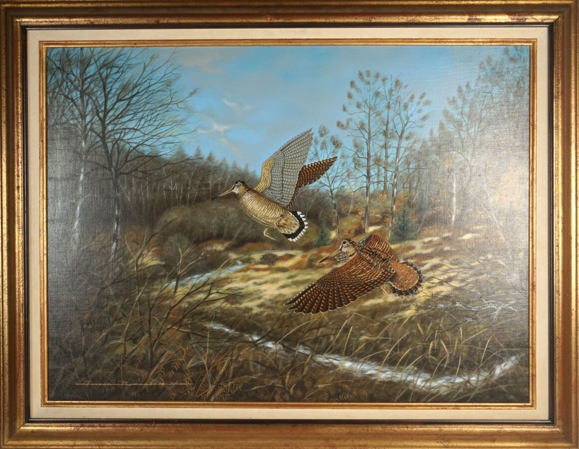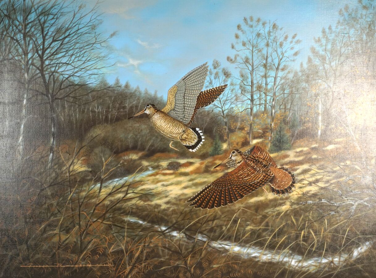 Pierre ROUSSIA (1951), "Les bécasses" Juin 2001, huile sur toile signée et datée en bas à gauche, contresignée, datée et située au dos, 54.6 x 73.5 cm.