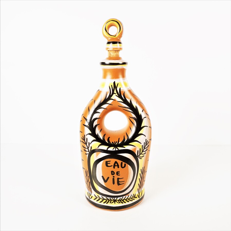 Pierre TOULHOAT (1923-2014) - KERALUC QUIMPER : Bouteille "Eau de vie" et verseuse en faïence émaillée jaune, blanche et noire, la bouteille marquée du cachet de l'artiste, H. 30.5 cm et 12 cm (fêle à la verseuse).