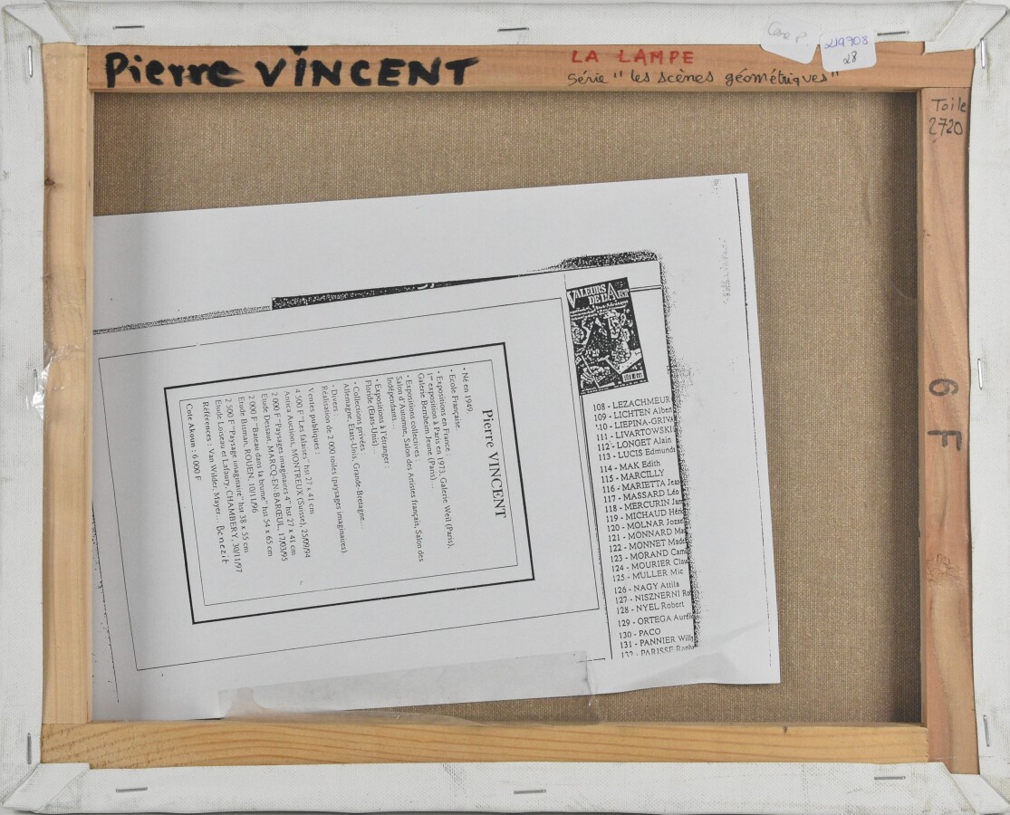 Pierre VINCENT (1949), "La lampe", série Les scènes géométriques, huile sur toile signée en bas à gauche, 33 x 41 cm.