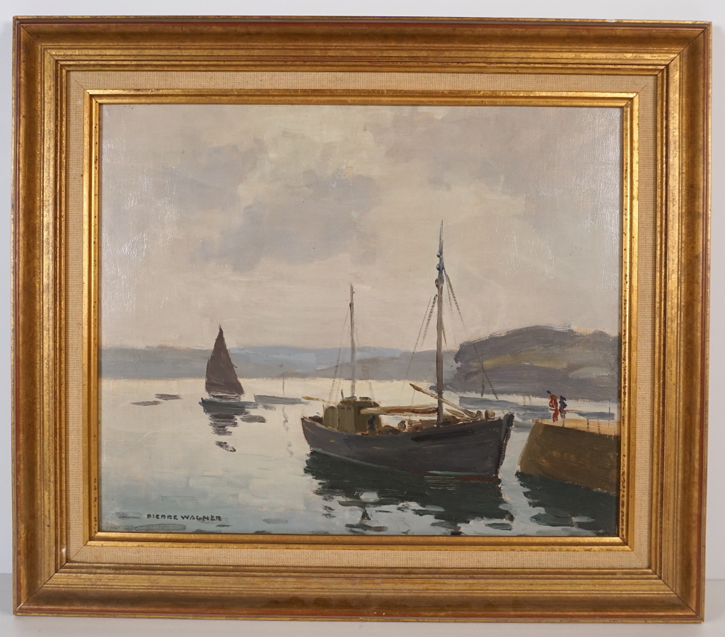Pierre WAGNER (1897-1943), "Marine, Deux-Mâts près de la jetée", huile sur toile signée en bas à gauche, 38 x 45 cm.