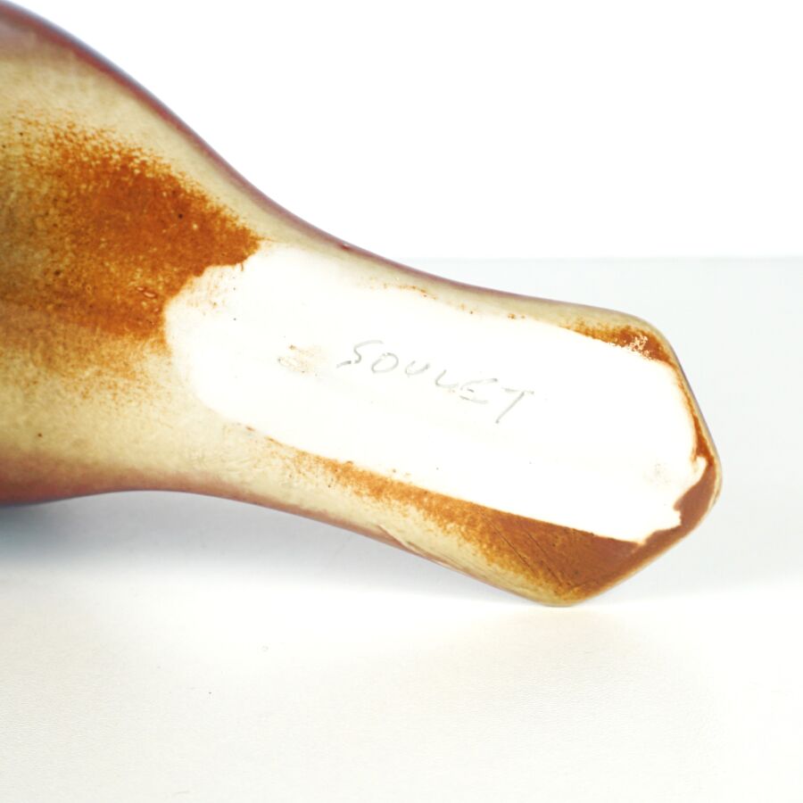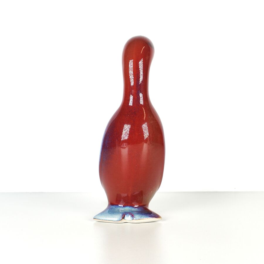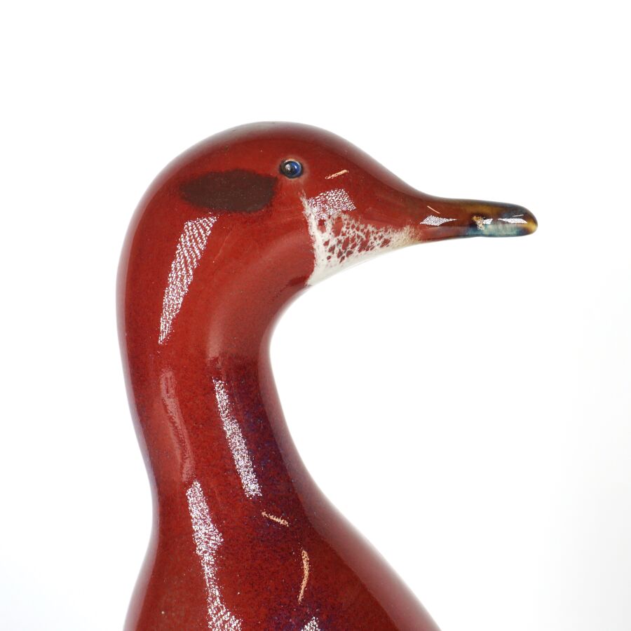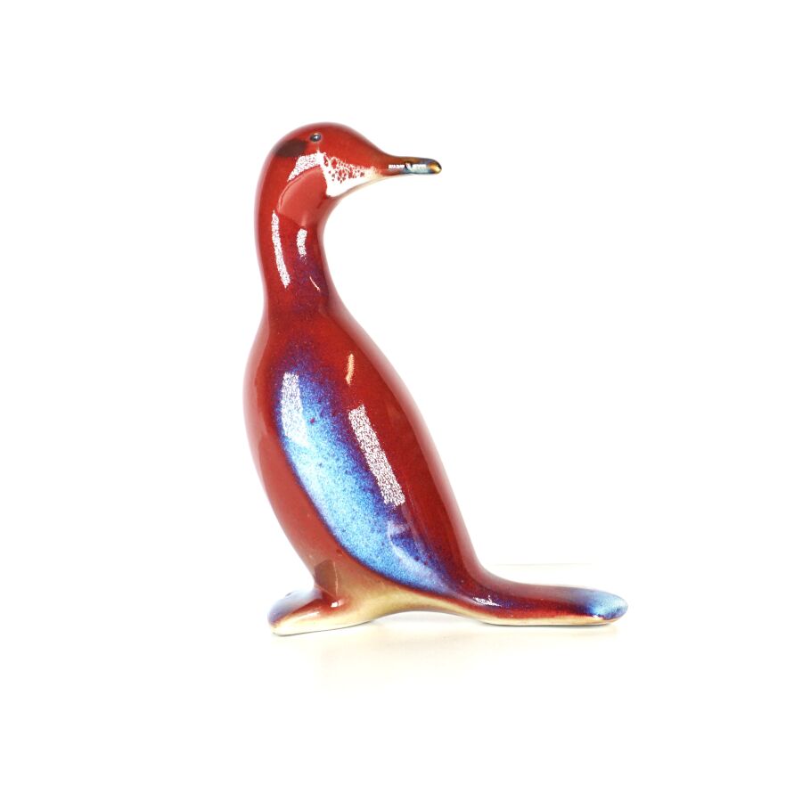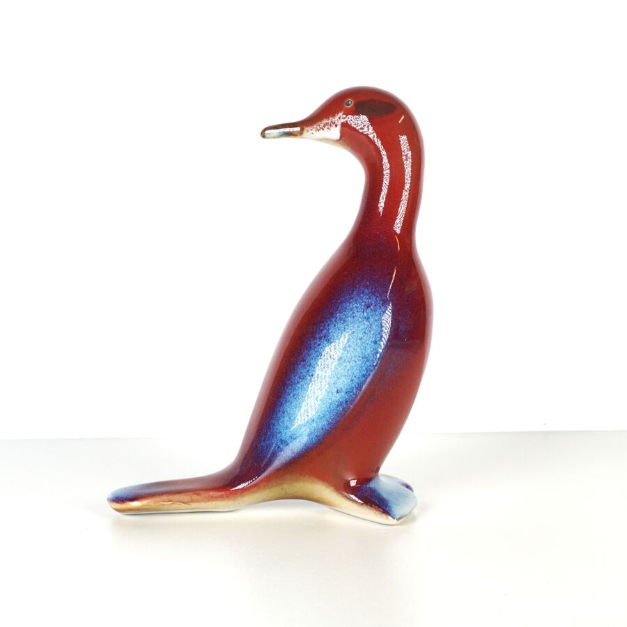 Pierrette SOULET (XXe), " Cormoran ", sujet en grès émaillé en rouge et bleu, signé dessous, H. 29 cm.