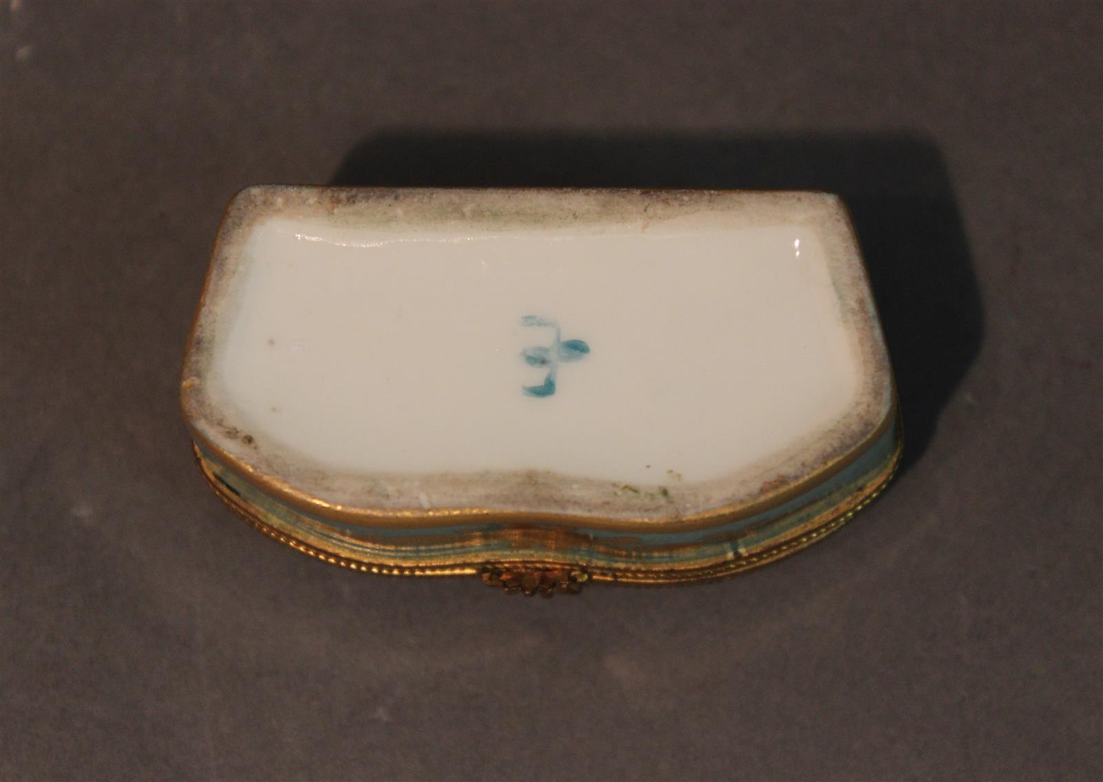 Pilulier en porcelaine à fond vert céladon, à décor de fleurs dans des cartouches rehaussés à l'or, monture en métal doré, début 20e siècle, L. 7 cm