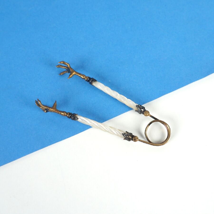 Pince à sucre en métal doré, les prises à motif de pattes de coq, manche en nacre torsadé, 19ème siècle, L. 9.5 cm.