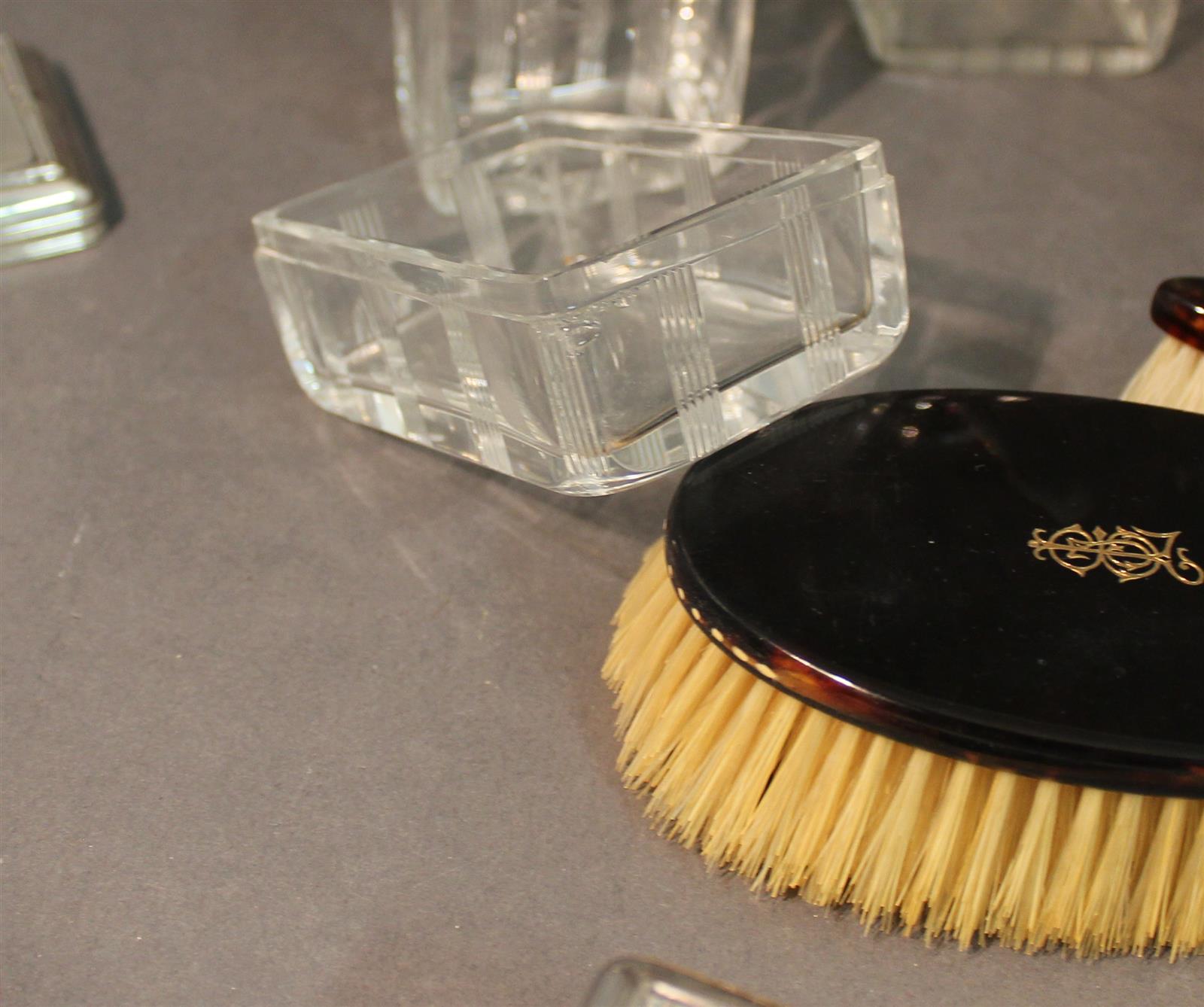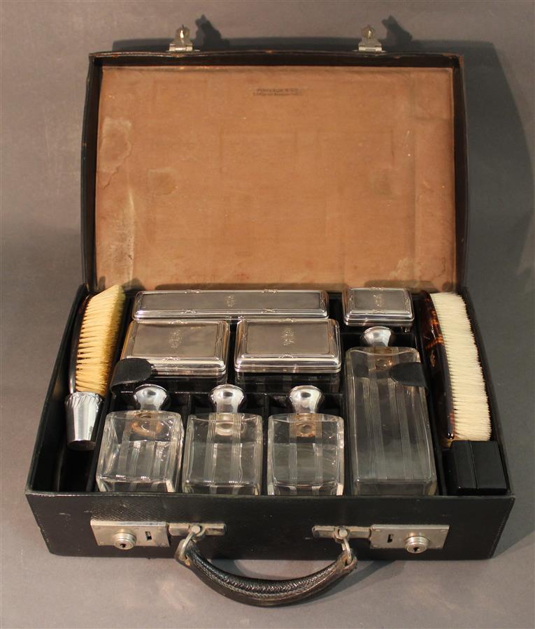 PINTEAUX ET Cie : Valise de toilette présentant un nécessaire en cristal et argent, comprenant : 4 flacons, 4 boîtes monogrammées, 3 brosses, 4 boîtes rectangulaires (dont 3 avec accidents au col de la verrerie) et 1 gobelet, 38.5 x 25 x H. 11 cm (avec sa clé)