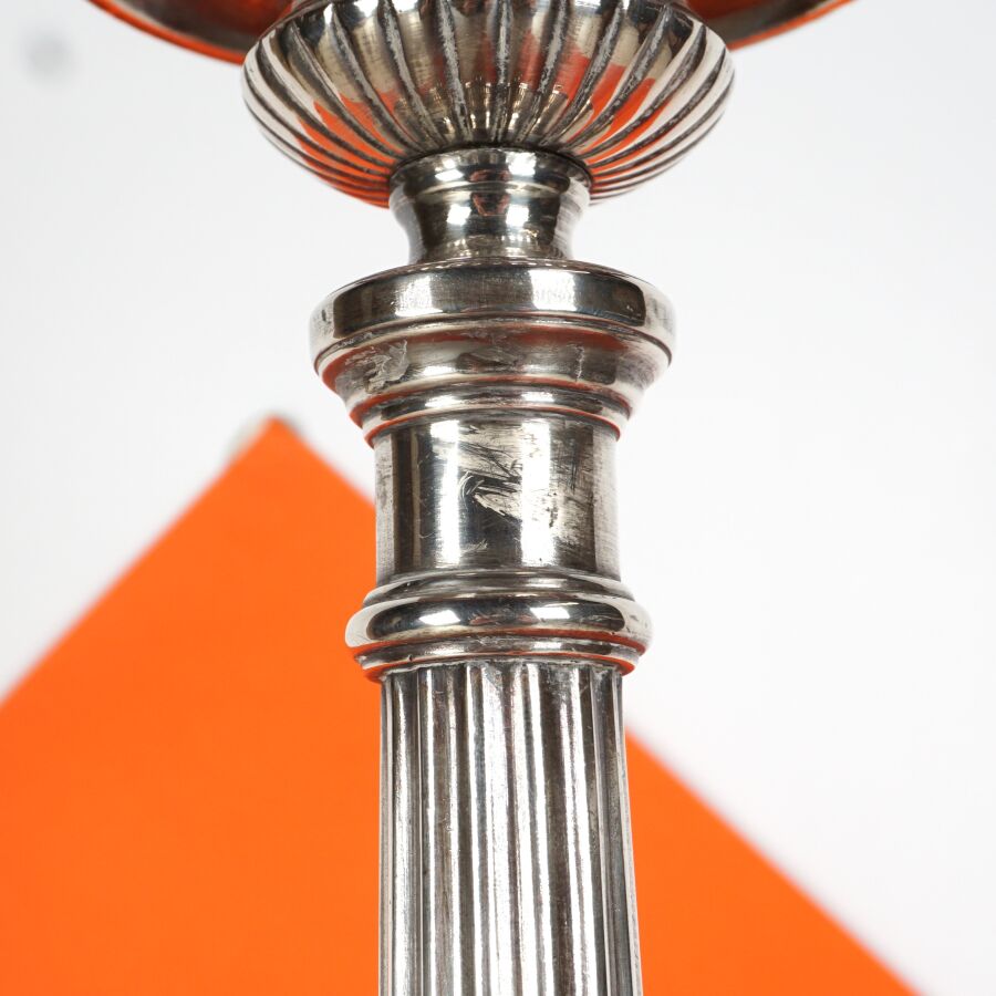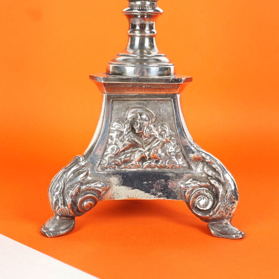 Pique-cierge en métal argenté, le fût de forme balustre, reposant sur base tripode orné de trois rondes-bosses, H. 47 cm (rayures).